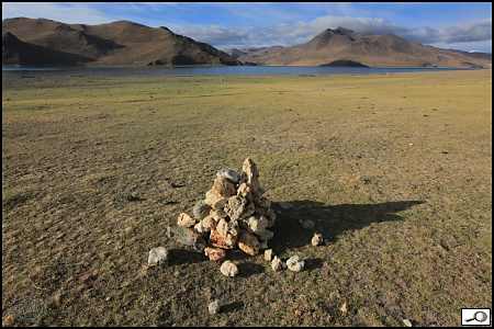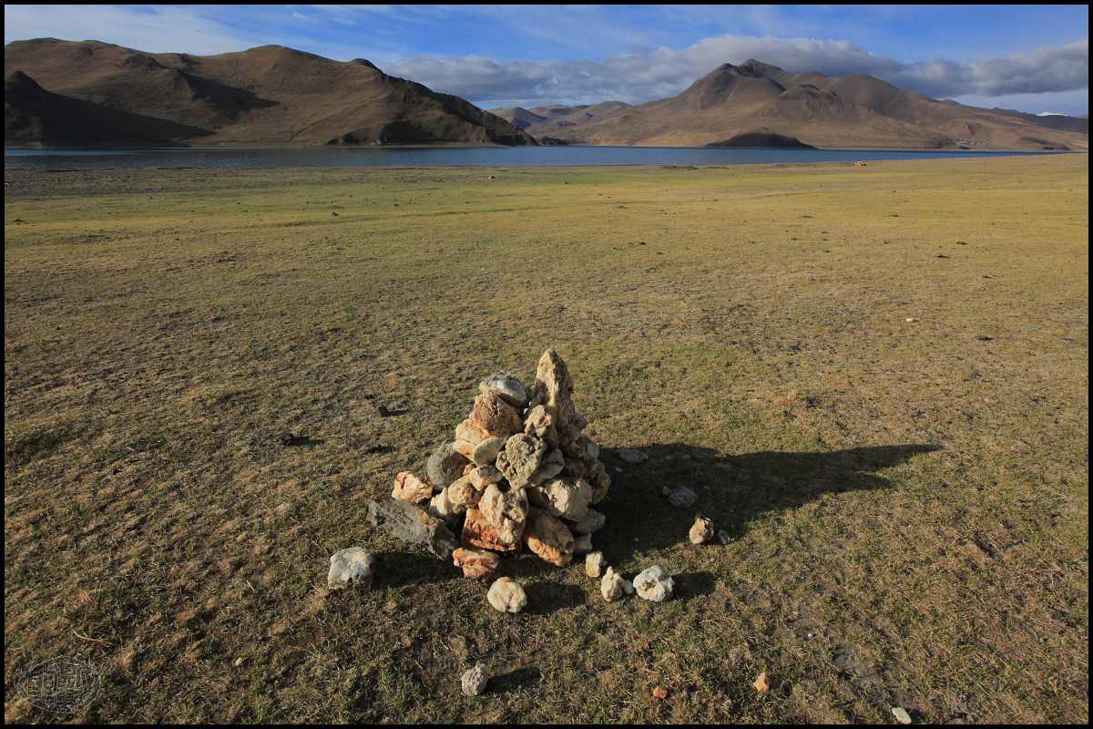 Přímo u jezera to už byl tvrdší oříšek. Široká pláň, a co s ní? Naštěstí si tam lidé budují z kamenů maličké pomníčky jako památku na zesnulé. S ohniskem ekv. 19 mm vypadá takový pomníček jako výrazný markant v popředí krajiny. Volil jsem tu centrální kompozici, nemyslím, že by jiná byla v tomto případě účelná. Expoziční kompenzace tu byla -1 EV, to proto, že slunce bylo velmi ostré a hrozilo nebezpečí přepalů. Clona 20 a ISO 500 – není třeba se za sluníčka takového ISO bát.