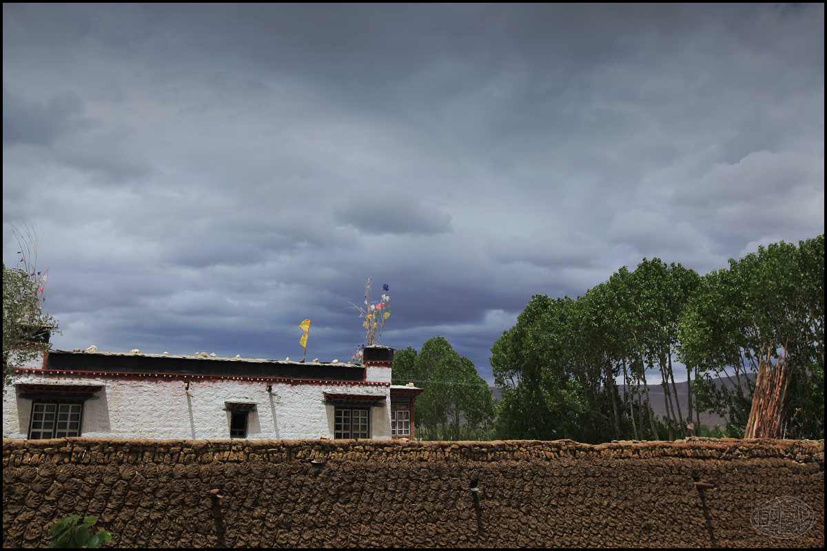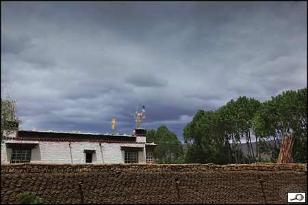 Zvenčí to vypadá takto – za zdí pojednanou trusem jaků (po vysušení je to univerzální palivo) je bíle natřený domek s modlitbičkami na střeše.