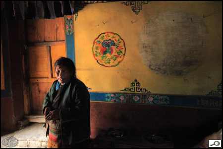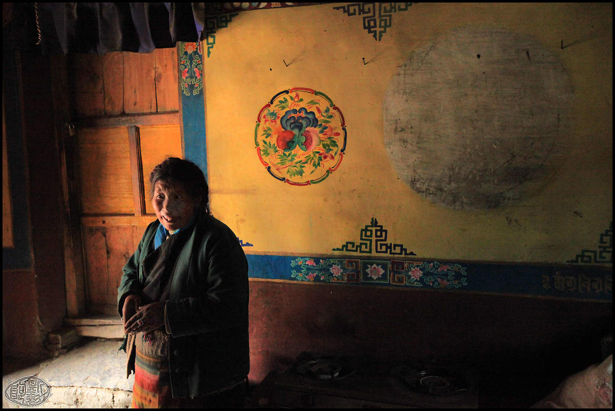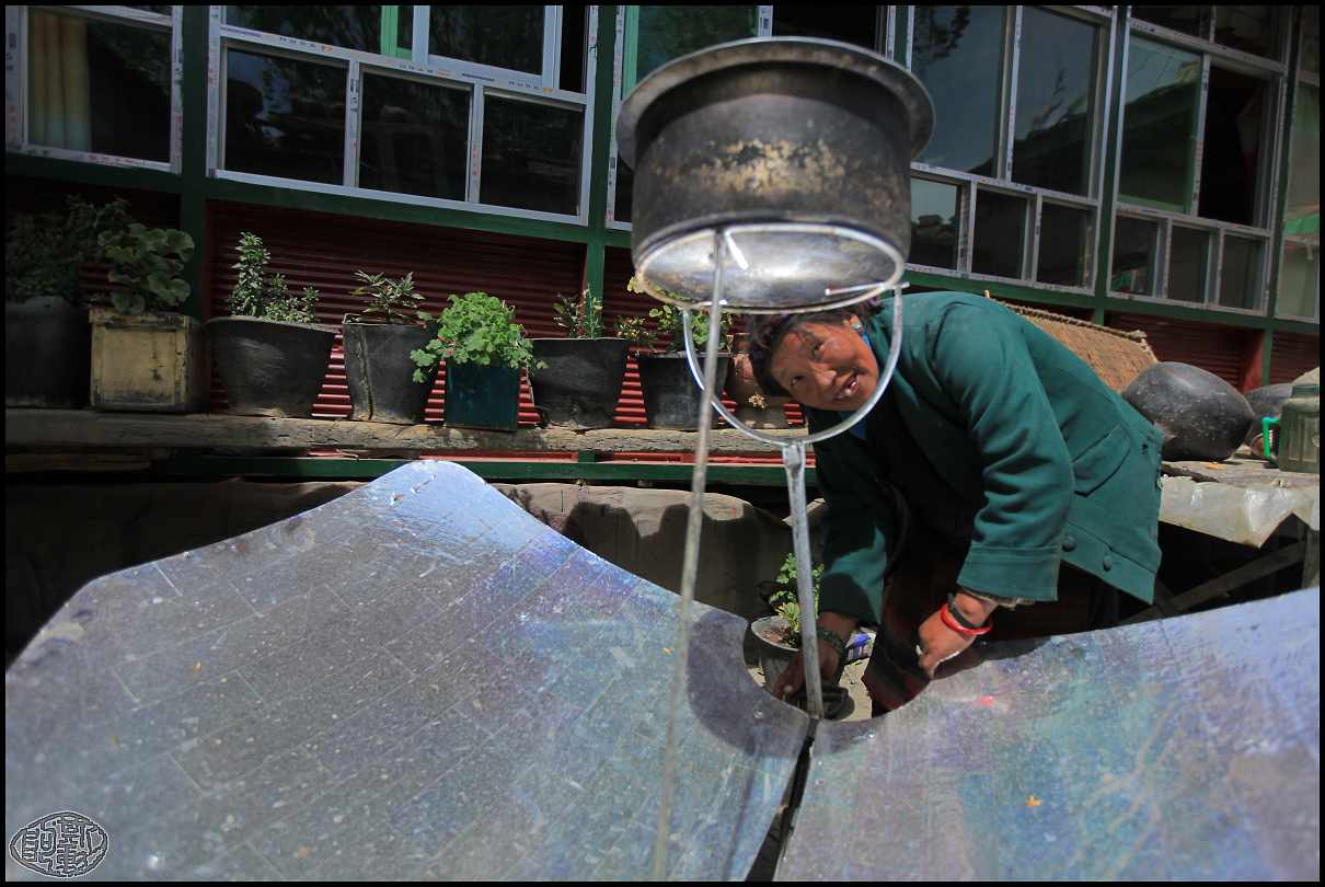 Tady na obrázku je paní domu – a obsluhuje vymoženost, kterou vidíme v Tibetu velmi často. Je to solární ohřívač vody,zřejmě “samo domo” výrobva. Ty lesklé plochy jsou z papundeklu polepeného alobalem a nahoře je v ohnisku paraboly čajník. Nedoporučuji strkat tam ruku, pálí to. Vyzkoušel jsem to. Kdybyste tam byli, taky byste to zkusili.