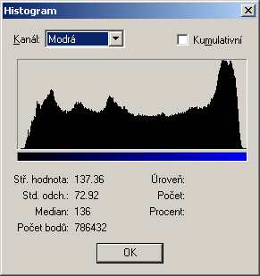 Na této dvojici jasně vidíte, jak velký je rozdíl mezi modrým kanálem (vlevo) a červeným (vpravo). Modrý je bohatý, kdežto červený se krčí jen v těch nejtemnějších oblastech. Střední hodnota modrého je 137,36,kdežto u červeného činí 59,51. To je obrovský rozdíl a ten nám naznačuje, že z tohoto obrázku už plnohodnotný barevný obraz nestvoříme. Podívejme se, jak je to s histogramy kanálů obrázku, který je v pořádku.