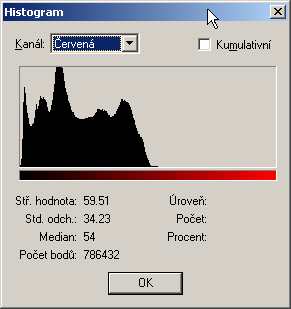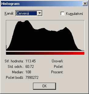 Na této dvojici jasně vidíte, jak velký je rozdíl mezi modrým kanálem (vlevo) a červeným (vpravo). Modrý je bohatý, kdežto červený se krčí jen v těch nejtemnějších oblastech. Střední hodnota modrého je 137,36,kdežto u červeného činí 59,51. To je obrovský rozdíl a ten nám naznačuje, že z tohoto obrázku už plnohodnotný barevný obraz nestvoříme. Podívejme se, jak je to s histogramy kanálů obrázku, který je v pořádku.