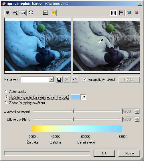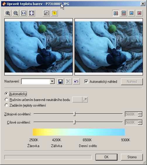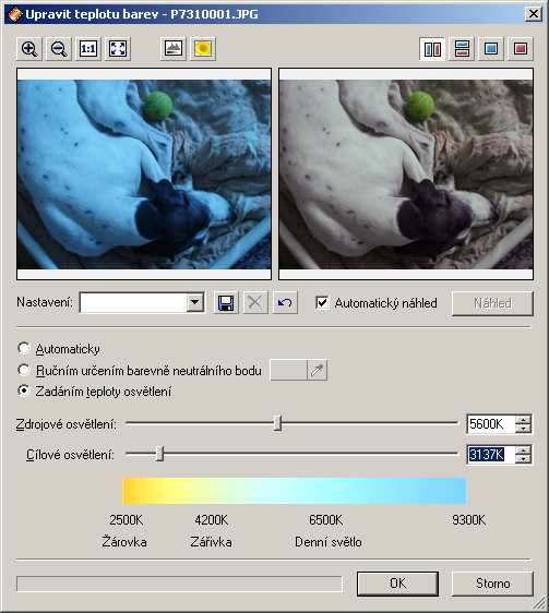 Zbavili jsme se sice modré, avšak obraz dostal nepříjemný šedočervený nádech. Pokusíme se tedy o třetí metodu, zadáním teploty osvětlení. Zdrojové osvětlení je “to jak to má být”, kdežto cílové je “jak to bylo nastaveno”. V tomto případě byla nastavena žárovka. Zkusme ji tedy nastavit. Obraz se změnil, modrá zmizela, ale nahradil ji načervenalý nádech.