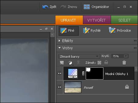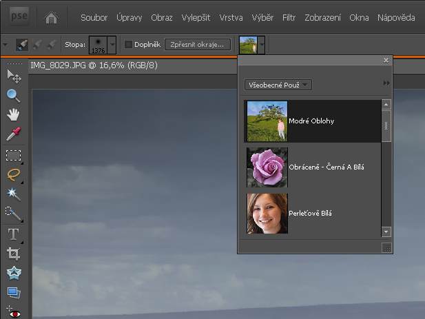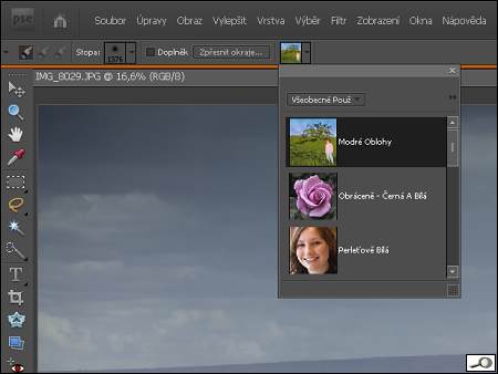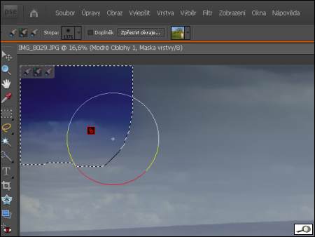 ![]() Otevřeme si ho v PS Elements a aktivujeme nástroj Inteligentní štětec, který nalezneme v nástrojové liště vlevo. Pro názornost jsem jeho ikonu zvětšenou vkopíroval do obrázku: ![]() Po jeho aktivaci si rozbalíme nabídku na horní liště: ![]() Nabídek je mnoho (vrátíme se k nim), na forhontě je modrá obloha. Tak do toho! Zvolíme modrou oblohu a inteligentním štětcem začneme malovat tam, kde by obloha měla být modrá: ![]() Takhle nějak to vypadá při práci: nadefinovali jsme velikost stopy a malujeme. Štětec se chová jako kříženec normálního štětce a kouzelné hůlky. Vidíme, že vybrané partie vybarvuje modře, přičemž modrou aplikuje jako přechod. A nejen to! Když s epodíváme na paletu vrstev, spatříme vrstvu úprav spolu s maskou, na ikonce úprav je vidět přechod, a jako režim prolnutí je nastaveno ztmavit barvy. To, že jde vlastně o vymaskování obrazu, později využijeme. ![]() Vlastnosti přechodu se dají upravit tak, že klikneme na červený terčík uprostřed výběru a otevře se karta, kde upravujeme způsob přechodu (lineární, kruhový, kosočtverečný, ten lineární je nejpraktičtější, dále úhel, přičemž 90 stupňů znamená, že tmavé je nahoře a světlé dole, velikost je parametr určující míru zesvětlováné a zarovnat s vrstvou určí, jak výplň vykryje vybranou část obrazu. Pro modré nebe je nejvýhodnější implicitní nastavení. Takto to vypadá po úpravě: ![]() Řeknete, že pěkné, ale že to hodně vzalo ty hory. Vlevo nahoře vidíme ikonky “ubrat z výběru” a “přidat k výběru”, případně “nový výběr”. Jenže on zas ten inteligentní štětec není zas tak moc inteligentní. Naštěstí my víme, že jde o vymaskovanou úpravu a můžeme tedy normálním štětcem masku upravit: černou barvou malujeme po ploše v režimu maska a fakticky ubíráme od výběru. Výsledek vidíte na ukázce – na ikoně masky jsou vidět i vykryté mraky a horizont. ![]() Na tom ale nemusíme zůstat. Inteligentní štětec lze použít znovu. Jdeme zpátky na vrstvu pozadí a otevřeme si nabídku inteligentních štětsů. V oddílu Příroda najdeme ztmavenou zeleň. Postupujeme podobně, jako prve. Výsledek není nejdřív moc patrný, ale jakmile nastavíme režim prolnutí na násobit, výsledek se dostaví. No a pak lze všechno ještě doladit nastavením průhlednosti těch efektových vrstev. Po sloučení vrstev můžeme pokračovat v editaci, například dooladit obrázek křivkami, ve výběru upravit sytost a podobně. No a výsledek rozhodně není vyšisovaný obrázek… ![]() Ono to všechno vypadá složitě, když se to čte. Je třeba mít po ruce PSE a vyzkoušet si to. Ten původní obrázek si můžete stáhnout zde a na něm se cvičit. Je oproti origuinálu jentrochu zmenšený, aby to nebyl datově takový macek. |