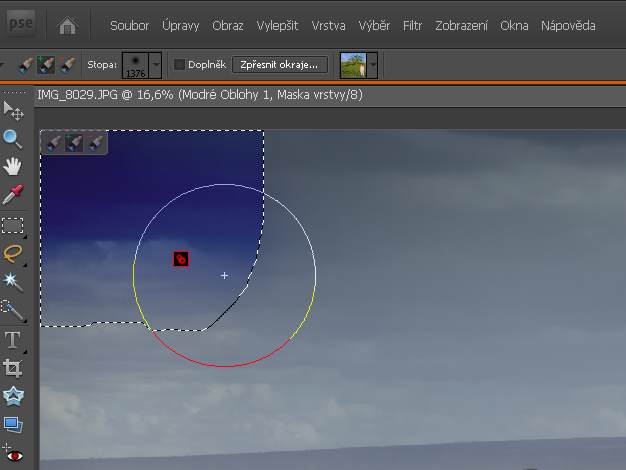 ![]() Otevřeme si ho v PS Elements a aktivujeme nástroj Inteligentní štětec, který nalezneme v nástrojové liště vlevo. Pro názornost jsem jeho ikonu zvětšenou vkopíroval do obrázku: ![]() Po jeho aktivaci si rozbalíme nabídku na horní liště: ![]() Nabídek je mnoho (vrátíme se k nim), na forhontě je modrá obloha. Tak do toho! Zvolíme modrou oblohu a inteligentním štětcem začneme malovat tam, kde by obloha měla být modrá: ![]() Takhle nějak to vypadá při práci: nadefinovali jsme velikost stopy a malujeme. Štětec se chová jako kříženec normálního štětce a kouzelné hůlky. Vidíme, že vybrané partie vybarvuje modře, přičemž modrou aplikuje jako přechod. A nejen to! Když s epodíváme na paletu vrstev, spatříme vrstvu úprav spolu s maskou, na ikonce úprav je vidět přechod, a jako režim prolnutí je nastaveno ztmavit barvy. To, že jde vlastně o vymaskování obrazu, později využijeme. ![]() Vlastnosti přechodu se dají upravit tak, že klikneme na červený terčík uprostřed výběru a otevře se karta, kde upravujeme způsob přechodu (lineární, kruhový, kosočtverečný, ten lineární je nejpraktičtější, dále úhel, přičemž 90 stupňů znamená, že tmavé je nahoře a světlé dole, velikost je parametr určující míru zesvětlováné a zarovnat s vrstvou určí, jak výplň vykryje vybranou část obrazu. Pro modré nebe je nejvýhodnější implicitní nastavení. Takto to vypadá po úpravě: ![]() Řeknete, že pěkné, ale že to hodně vzalo ty hory. Vlevo nahoře vidíme ikonky “ubrat z výběru” a “přidat k výběru”, případně “nový výběr”. Jenže on zas ten inteligentní štětec není zas tak moc inteligentní. Naštěstí my víme, že jde o vymaskovanou úpravu a můžeme tedy normálním štětcem masku upravit: černou barvou malujeme po ploše v režimu maska a fakticky ubíráme od výběru. Výsledek vidíte na ukázce – na ikoně masky jsou vidět i vykryté mraky a horizont. ![]() Na tom ale nemusíme zůstat. Inteligentní štětec lze použít znovu. Jdeme zpátky na vrstvu pozadí a otevřeme si nabídku inteligentních štětsů. V oddílu Příroda najdeme ztmavenou zeleň. Postupujeme podobně, jako prve. Výsledek není nejdřív moc patrný, ale jakmile nastavíme režim prolnutí na násobit, výsledek se dostaví. No a pak lze všechno ještě doladit nastavením průhlednosti těch efektových vrstev. Po sloučení vrstev můžeme pokračovat v editaci, například dooladit obrázek křivkami, ve výběru upravit sytost a podobně. No a výsledek rozhodně není vyšisovaný obrázek… ![]() Ono to všechno vypadá složitě, když se to čte. Je třeba mít po ruce PSE a vyzkoušet si to. Ten původní obrázek si můžete stáhnout zde a na něm se cvičit. Je oproti origuinálu jentrochu zmenšený, aby to nebyl datově takový macek. |