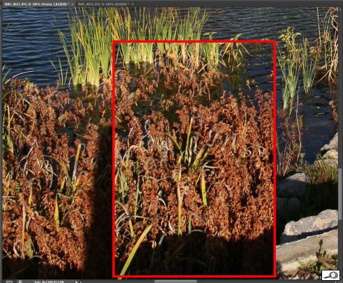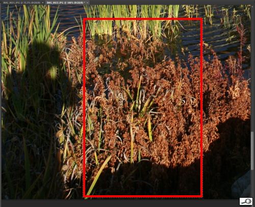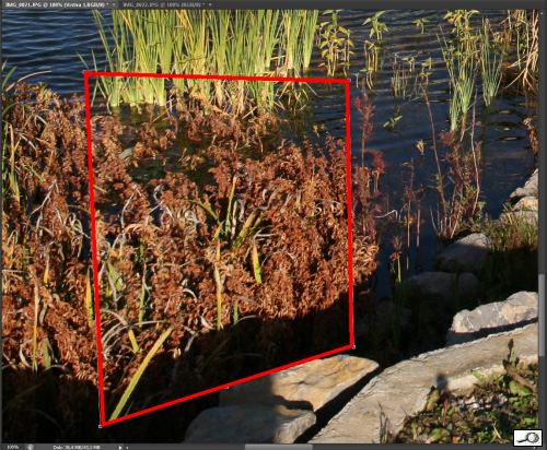 Ale to by nemělo vadit, vadu napravíme v editoru. Otevřu teď oba obrázky v Photoshopu. V tom pomocném obrázku (pořízeném poté, co jsem ustoupil na stranu) dám do výběru to kritické místo a zkopíruju ho do schránky pomocí kombinace Ctrl+C. Místo jsem zde na ukázce zvýraznil červeně, v reálu tam budete mít pochodující mravence.