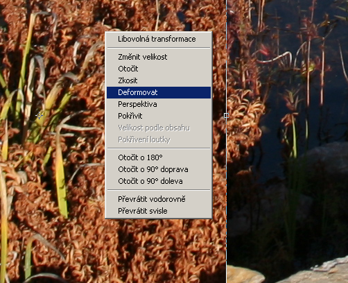 Zbývá poslední operace. Je třeba pokud možno přesně dát obsah výběru tam kam patří. Je ovšem pokřivený, nepasuje. K přesnému napasování slouží nástroj Transformace – klávesová zkratka Ctrl+T. Pak klepneme pravým uchem myši do rámečku který se vytvořil a z menu vybereme variantu Deformovat.