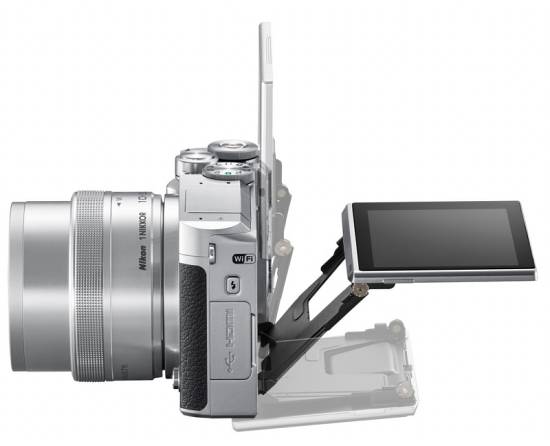 Skvělý je LCD displej, je výklopný až o 180 stupňů – moc dobré pro selfie autoportréty, je třípalcový a dotykový. Elektronická závěrka má rozsah od 30 sec do 1/16000 sec. Expoziční režimy jsou auto, program a priorita času / clony plus předvolby a filtry, jak ještě uvidíme. Přístroj má vestavěný blesk s podivuhodně nízkou synchronizační rychlostí 1/60 sec. Výstupy jsou microHDMI a USB a wifina s NFC (párování přiložením k přístroji). Zapisuje ve formátu JPEG nebo RAW (NEF) na karty microSD, v režimu video umí i 4K. Tělo váží 231 g a měří 98 x 60 x 32 mm.