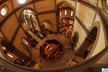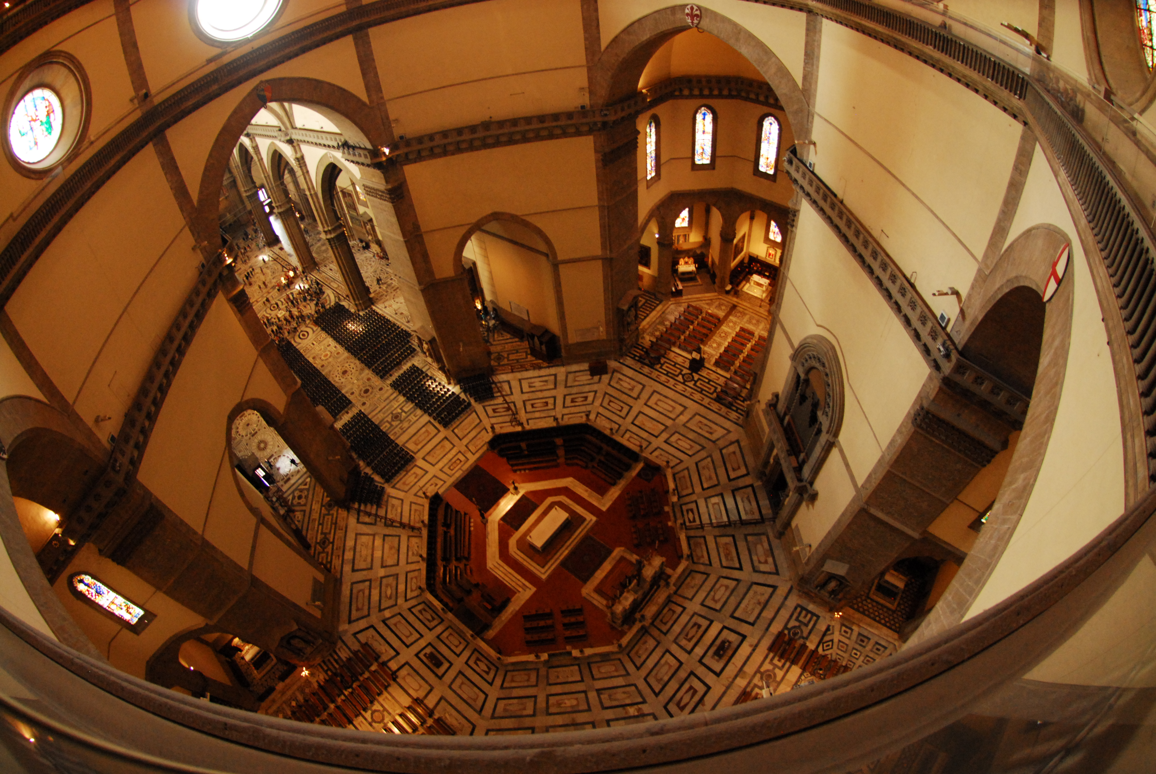 ![]() Snímek je pořízen z ochozu a opravdu zobrazuje celý prostor chrámu. Je patrné silné perspektivní zkreslení – k němu dochází u všech širokoúhlých objektivů a čím je úhel širší, tím je zkreslení výraznější. Tohoto zkreslení lze použít k různým výtvarným efektům. Takovou ukázku máme zde: