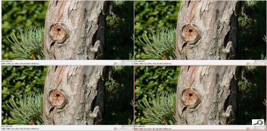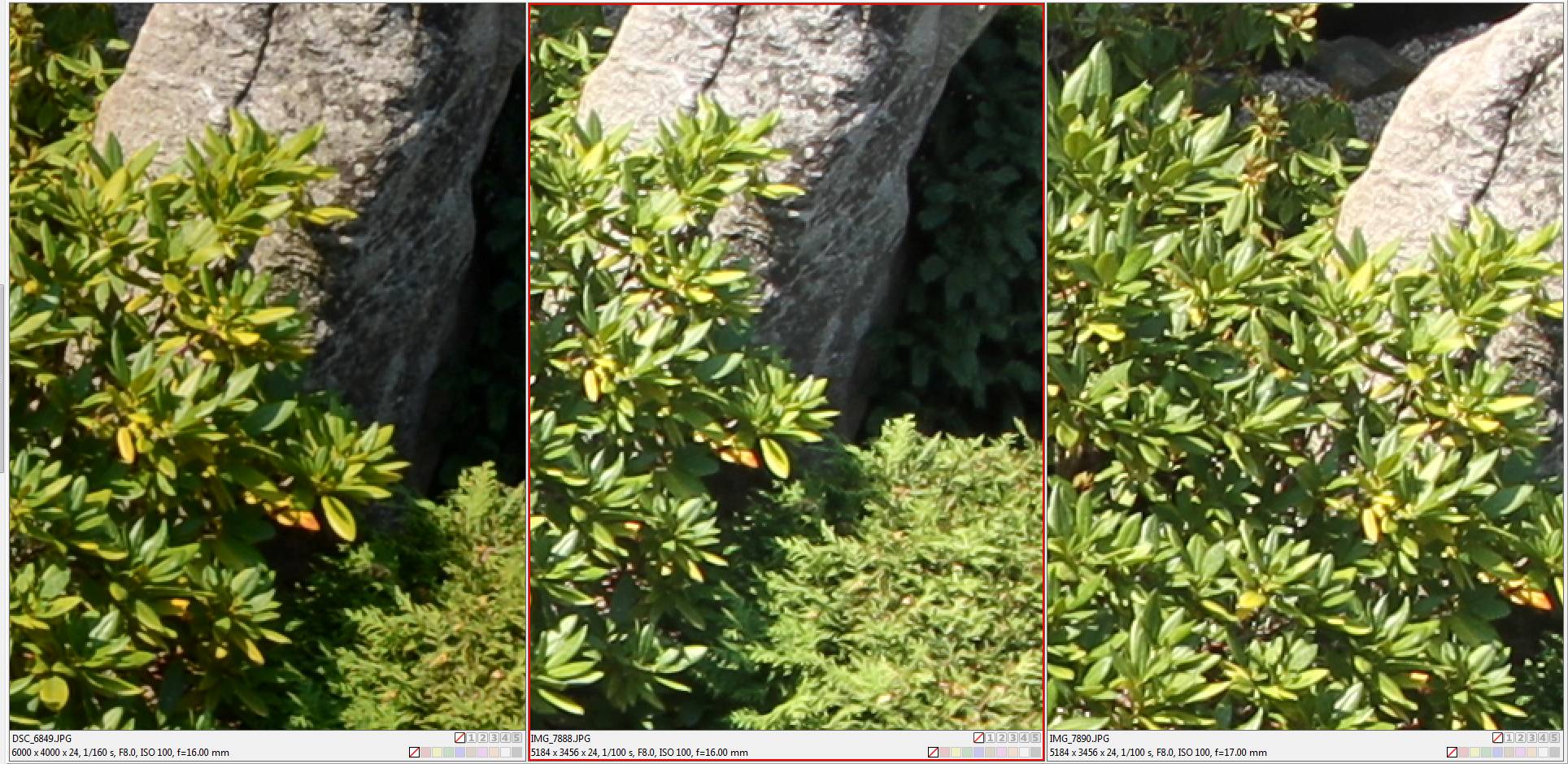 Kresba měkne ke krajům a do rohu velmi zvolna. Srovnával jsem to s objektivy Canon 10-22 a elkovým 17-40 a výsledek byl přibližně stejný, byl i o něco lepší než výsledky jinak výtečného objektivu Fujifilm 16-55. Zde je ukázka srovnání Nikon – Canon 10-22 a Canon 17-40 při 200% zvětšení. Na množství detailů jsou na tom v podstatě stejně.