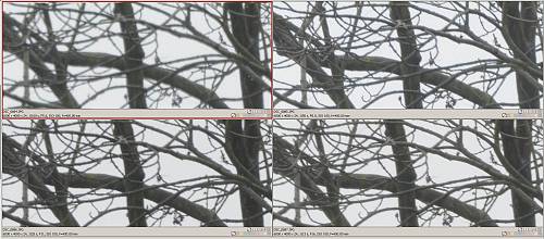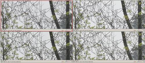 Srovnání výkonu stabilizace. Vlevo nahoře vypnuto při 1/50 sec, vpravo režim aktivní, dole vlevo normální a dole vpravo stativ s vypnutou stabilizací.