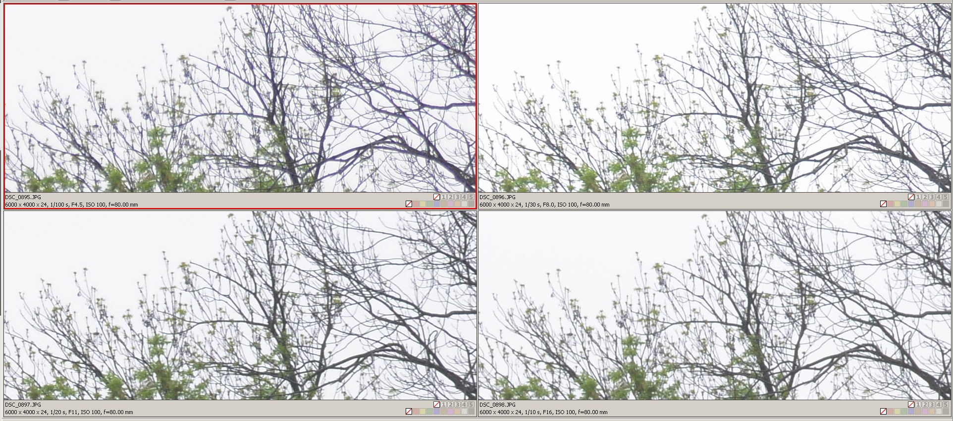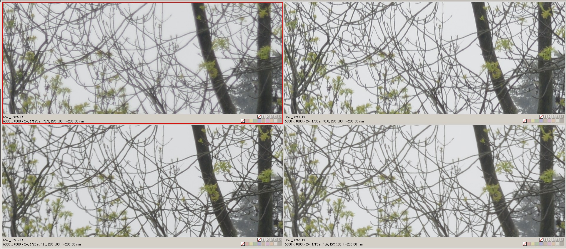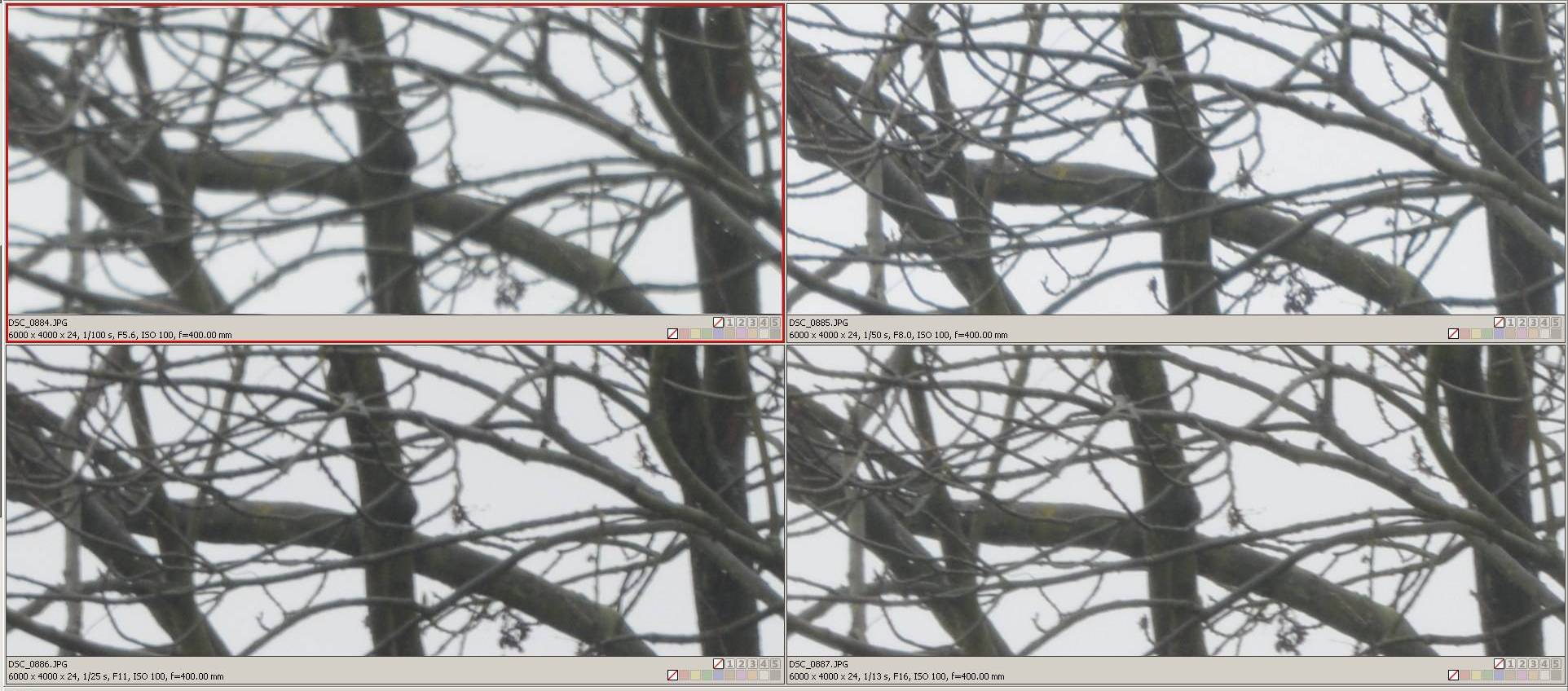 Zde jsou srovnávací snímky při různých clonách. Jde vždy o výřez 100% z rohu obrázku, čim DX (Nikon D7100). Nejdříve je to při 400 mm: