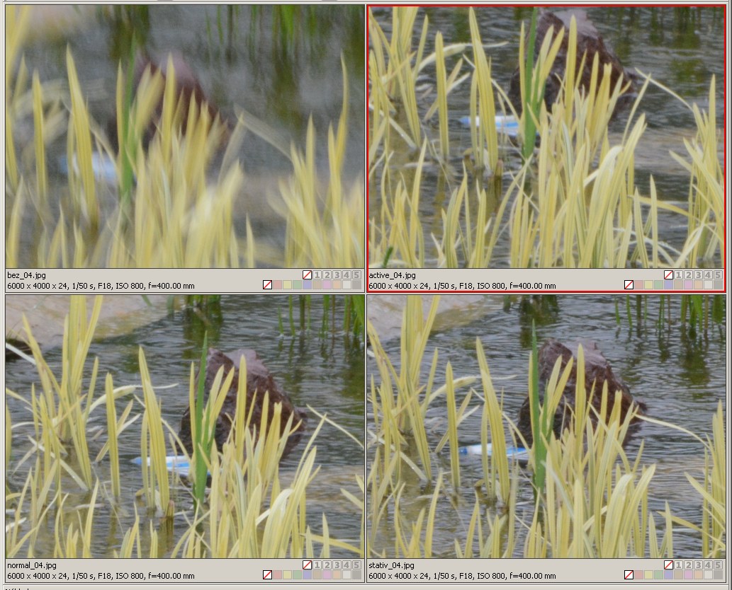 Srovnání výkonu stabilizace. Vlevo nahoře vypnuto při 1/50 sec, vpravo režim aktivní, dole vlevo normální a dole vpravo stativ s vypnutou stabilizací.