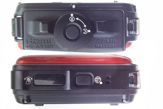O patrno níže je přepínač snímání / prohlížení. Je to v podstatě naprostý automat a přepínání režimů umožňuje volbu mezi automatickým a ještě víc automatickým režimem, nicméně obrázku lze pomoci tlačítky na čtyřcestném voliči o patro níže: vpravo korekce expozice, nahoře blesk, vlevo samospoušť a dole makro. Úplně dole je tlačítko pro menu a koš na mazání fotek. Na levém boku (z pohledu fotografa) je dvojice tlačítek – horním zapneme mapu spolupracující s GPS (šikovné) a dolním zapínáme „klepací ovládání“ -počítá se s tím, že pod vodou nebo v rukavicích je pohodlnější přístrojem zamávat a on udělá, co potřebujeme. Jistě je to užitečné, já tomu na chuť nepřišel, asi jsem nepracoval v dosti ztížených podmínkách.