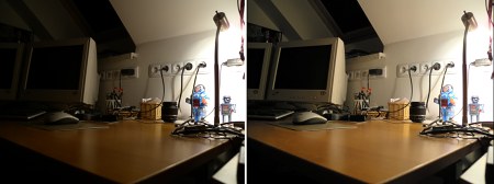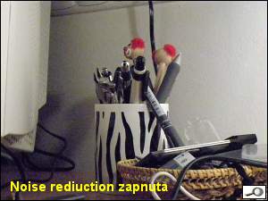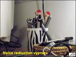 V citlivostech 3200 a 6400 se šetřilo v defaultním nastavení s redukcí šumu. Obvykle totiž – paradoxně – v extrémních hodnotách ISO dochází ke zdánlivému zklidnění, což je ve skutečnosti rozostření a rozmydlení. To zde nehrozí. Mezi obrázky s nastavenou a nenastavenou redukcí šumu (noise reduction) není prakticky žádný rozdíl a nepomůže ani stažení softwarového doostření. Zkrátka, kompakty nemají rády vysoké citlivosti a tento není (nemůže být vzhledem k rozměrům čipu) výjimkou. Dole ukázky s redukcí a bez redukce: