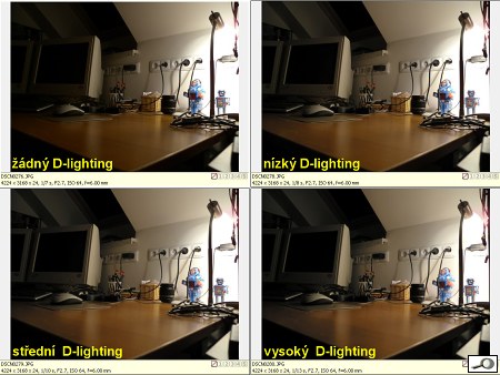 Objektiv má rozsah zoomu 1:4, odpovídající 28 až 112 mm plus 4násobný nigitální zoom. Přístroj má stabilizaci, ostří od 50 cm, v makru od 2 cm. Světelnost je F2.7 – F5.9 Ovládání a menu Přístroj se zapíná tlačítkem na horní stěně zcela vpravo, vpředu je spoušť s ovládáním zoomu a roller naplocho umístěný. Čtyřcestný volič má nahoře ovládání blesku, lze ho aktivovat jen při vyklopení reflektoru. Má režimy automat, vypnout (což je poněkud nelogické, ale je to tak, těžko si představit, že by někdo zapnul blesk jen proto, aby ho mohl vypnout), výplňkový s redukční červených očí, výplňkový, blesk do dlouhého času a blesk na druhou lamelu (blýskne těsně před ukončením expozice). Ty dva poslední režimy vřele doporučuji. Menu fotografování má čtyři obrazovky, zde stojí za pozornost Picture control. Zde můžeme nastavit kontrast, živost barev a doostření. Zajímavá je i volba v oblasti měření expozice, neboť kromě obvyklého zonálního středového a bodového měření lze nastavit i bodové měření v místě autofokusu. Pokud jde o autofokus, je zde samozřejmě i rozpoznávání obličejů (až 12 tváří). Aktuální nastavení lze uložit jako “user settings” (není přeloženo) pod položku U1 nebo U2. To je velmi jednoduché a příjemné řešení. Ke klasické v ýbavě nikonu patří možnost uložit sekvenci 16 snímků do jednoho obrázku a funkce BSS, kdy přístroj pořídi několik fotek za sebou a vybere nejostřejší z nich. O menu prohlížení šla řeč, v menu nastavení (setup) se nastaví čeština a další obvyklé věci včetně zapnutí/vypnutí stabilizace. Je zde i digitální zoom, lze nastavit na “ořez”, což je lepší, protože pak jde o výřez a nikoli o devastující převzorkování obrazu. No a při 13,5 Mpx je masa k řezání až až. Je v tom ale vychytávka, která se nedá z návodu vyčíst. Abyste mohli funkci “ořez” použít, musíte nejdřív snížit rozlišení snímku. Tohle věru není fér k uživateli (chyba návodu), ale je to i mrzuté řešení. Ten ořez se přece dá dělat i z plného formátu a není třeba se obtěžovat zmenšováním obrázku. Nakonec z toho plyne poučení: digitální zoom raději nepoužívejte… Jak se s ním fotí ![]() D-lighting má tři nastavitelné úrovně, jak v aktivním režimu (tedy při focení), pak v režimu prohlížení, kdy upravíte snímek a ten se uloží pod novým názvem – a začíná nikoli na DSCN, ale FCSN. Lépe funguje při následné úpravě, v režimu active jeho výsledky nebyly oslnivé, viz ukázka, kdy rozdíly jsou vskutku prachnepatrné: ![]() ![]() Šum je oblíbená šťouralská kapitola. Tak především: automatické nastavení ISO je tu velmi dobře řešení. Přístroj nastavuje podle potřeby – na exotické hodnoty jako je třeba 364 ISO. Faktem je, že jako všechny kompakty i tento dává snesitelné obrázky do 400, v přimhouřením oka 800 ISO a dál už roste bída a utrpení.