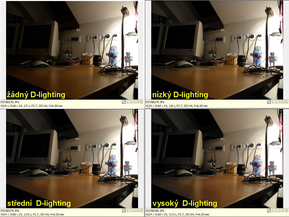 Objektiv má rozsah zoomu 1:4, odpovídající 28 až 112 mm plus 4násobný nigitální zoom. Přístroj má stabilizaci, ostří od 50 cm, v makru od 2 cm. Světelnost je F2.7 – F5.9 Ovládání a menu Přístroj se zapíná tlačítkem na horní stěně zcela vpravo, vpředu je spoušť s ovládáním zoomu a roller naplocho umístěný. Čtyřcestný volič má nahoře ovládání blesku, lze ho aktivovat jen při vyklopení reflektoru. Má režimy automat, vypnout (což je poněkud nelogické, ale je to tak, těžko si představit, že by někdo zapnul blesk jen proto, aby ho mohl vypnout), výplňkový s redukční červených očí, výplňkový, blesk do dlouhého času a blesk na druhou lamelu (blýskne těsně před ukončením expozice). Ty dva poslední režimy vřele doporučuji. Menu fotografování má čtyři obrazovky, zde stojí za pozornost Picture control. Zde můžeme nastavit kontrast, živost barev a doostření. Zajímavá je i volba v oblasti měření expozice, neboť kromě obvyklého zonálního středového a bodového měření lze nastavit i bodové měření v místě autofokusu. Pokud jde o autofokus, je zde samozřejmě i rozpoznávání obličejů (až 12 tváří). Aktuální nastavení lze uložit jako “user settings” (není přeloženo) pod položku U1 nebo U2. To je velmi jednoduché a příjemné řešení. Ke klasické v ýbavě nikonu patří možnost uložit sekvenci 16 snímků do jednoho obrázku a funkce BSS, kdy přístroj pořídi několik fotek za sebou a vybere nejostřejší z nich. O menu prohlížení šla řeč, v menu nastavení (setup) se nastaví čeština a další obvyklé věci včetně zapnutí/vypnutí stabilizace. Je zde i digitální zoom, lze nastavit na “ořez”, což je lepší, protože pak jde o výřez a nikoli o devastující převzorkování obrazu. No a při 13,5 Mpx je masa k řezání až až. Je v tom ale vychytávka, která se nedá z návodu vyčíst. Abyste mohli funkci “ořez” použít, musíte nejdřív snížit rozlišení snímku. Tohle věru není fér k uživateli (chyba návodu), ale je to i mrzuté řešení. Ten ořez se přece dá dělat i z plného formátu a není třeba se obtěžovat zmenšováním obrázku. Nakonec z toho plyne poučení: digitální zoom raději nepoužívejte… Jak se s ním fotí ![]() D-lighting má tři nastavitelné úrovně, jak v aktivním režimu (tedy při focení), pak v režimu prohlížení, kdy upravíte snímek a ten se uloží pod novým názvem – a začíná nikoli na DSCN, ale FCSN. Lépe funguje při následné úpravě, v režimu active jeho výsledky nebyly oslnivé, viz ukázka, kdy rozdíly jsou vskutku prachnepatrné: ![]() ![]() Šum je oblíbená šťouralská kapitola. Tak především: automatické nastavení ISO je tu velmi dobře řešení. Přístroj nastavuje podle potřeby – na exotické hodnoty jako je třeba 364 ISO. Faktem je, že jako všechny kompakty i tento dává snesitelné obrázky do 400, v přimhouřením oka 800 ISO a dál už roste bída a utrpení.
