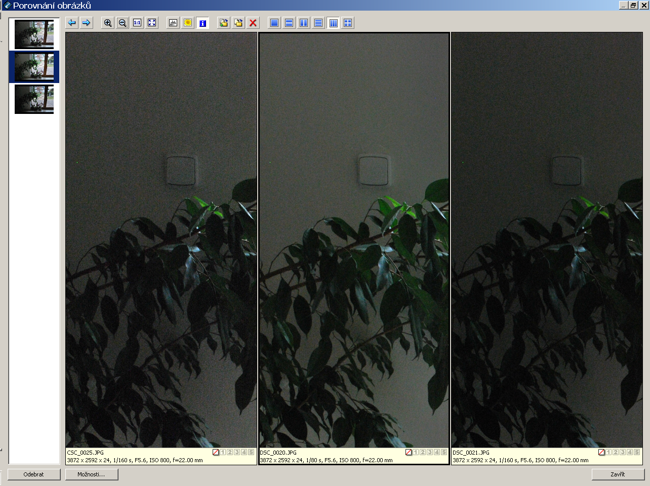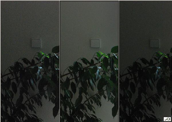 Projasnění stínů jsem už zmiňoval. Je zde dvojí, během fotografování a v režimu retuše, který zde má zvláštní menu. Obecně vzato, d-lighting není ani v jednom, ani v druhé případě moc efektivní. Rozhodně se doporučuje exponovat na jasy, protože jde o projasnění stínů. Na naší ukázce máme srovnání tří stinných partií. Vlevo je stín projasněn softwarově (tedy d-lightingem v režimu úpravy snímku), uprostřed je d-lighting při fotografování a vpravo bez d-lightingu. Lepší výsledky dává d-lighting při snímání, stín je jasnější a obraz je méně zašuměný. Přesto si myslím, že je zde prostor ke zlepšování. Dodám ještě, že při editačním d-lightingu přístroj nechá původní snímek a uloží nový pod trochu jiným názvem – není to obvyklý název Nikonů DSC, ale CSC a to může způsobit trochu zmatek. Na ukázce zároveň viidíte šum při 800 ISO, ten je na snímcích pořízench zrcadlovkami vždycky mnohem méně výrazný, než na snímcích z kompaktů.