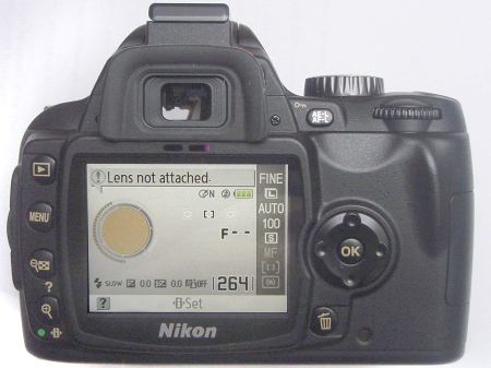 Ovládání a menu Přístroj se zapíná hned u spouště, to mají všechny DSLR od Nikonu společné a je to vynikající vlastnost. U spouště jsou dvě tlačítka, pro kompenzaci expozice a zapínání stavového displeje vzadu na LCD. Už je možné ho nechat zapnutý trvale, nemusí se tedy zapínat pokaždé znovu, což bylo předmětem mé kritiky u předchozího modelu. Pod očnicí je senzor, který displej vypne, jakmile přístroj přiložíte k oku. Navíc je displej výškově orientovaný – když fotíte na výšku, pořád pěkně vidíte menu stranově správně, tedy hlavou nahoru. Ovládání je dvoutlačítkové, to horní tlačítko ho uvede do stavu jaksi “informačního”, že vidíte, co je nastaveno, kdežto tlačítkem vlevo dole vedle displeje ho aktivujete a můžete měnit parametry. Má dvě grafická řešení, textové a “obrázkové”, že totiž se clona zobrazuje graficky, jako schema opravdu irisové clony, dokonce s náznakem indikace použité expoziční doby. Toto zobrazování stavu přístroje na celém LCD se v poslední době stává jakousi normou a je třeba tento trend chválit. Dodejme ještě, že v menu (zapíná se druhým tlačítkem shora vlevo od LCD) lze navolit různý vzhled pozadí menu, dokonce si tam můžete nahrát nějaký obrázek jako tapetu. Jakmile ale stiskneme tlačítko vlevo dole, přecházíme z grafického řešení stavového displeje do normálního a zde volíme parametry.