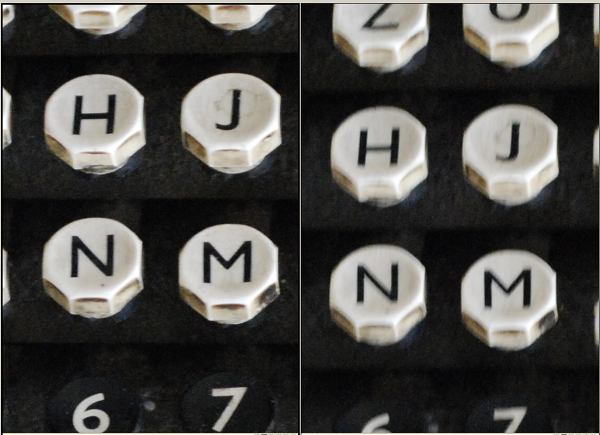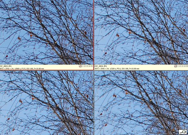 Přístroj jsem zkoušel s kitovým objektivem AF-S DX VR NIKKOR 18-55 mm. Ten je pozoruhodně kvalitní s velmi dobrou a stabilní kresbou už od plné světelnosti, je to patrné ze srovnání zobrazení 1:1 s rohové partie obrazu):