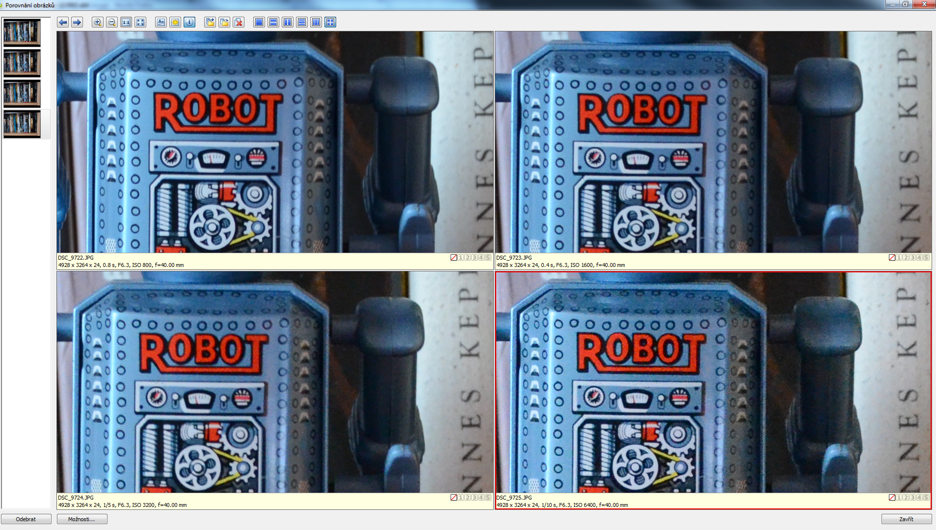 1 až 6 denní světlo, 7 a 8 s vestavěným bleskem, 9 při ISO 400, 10 při ISO 1600, 11 při ISO 3200, 12 při 6400 ISO, převedeno z RAW přes Camera Raw.