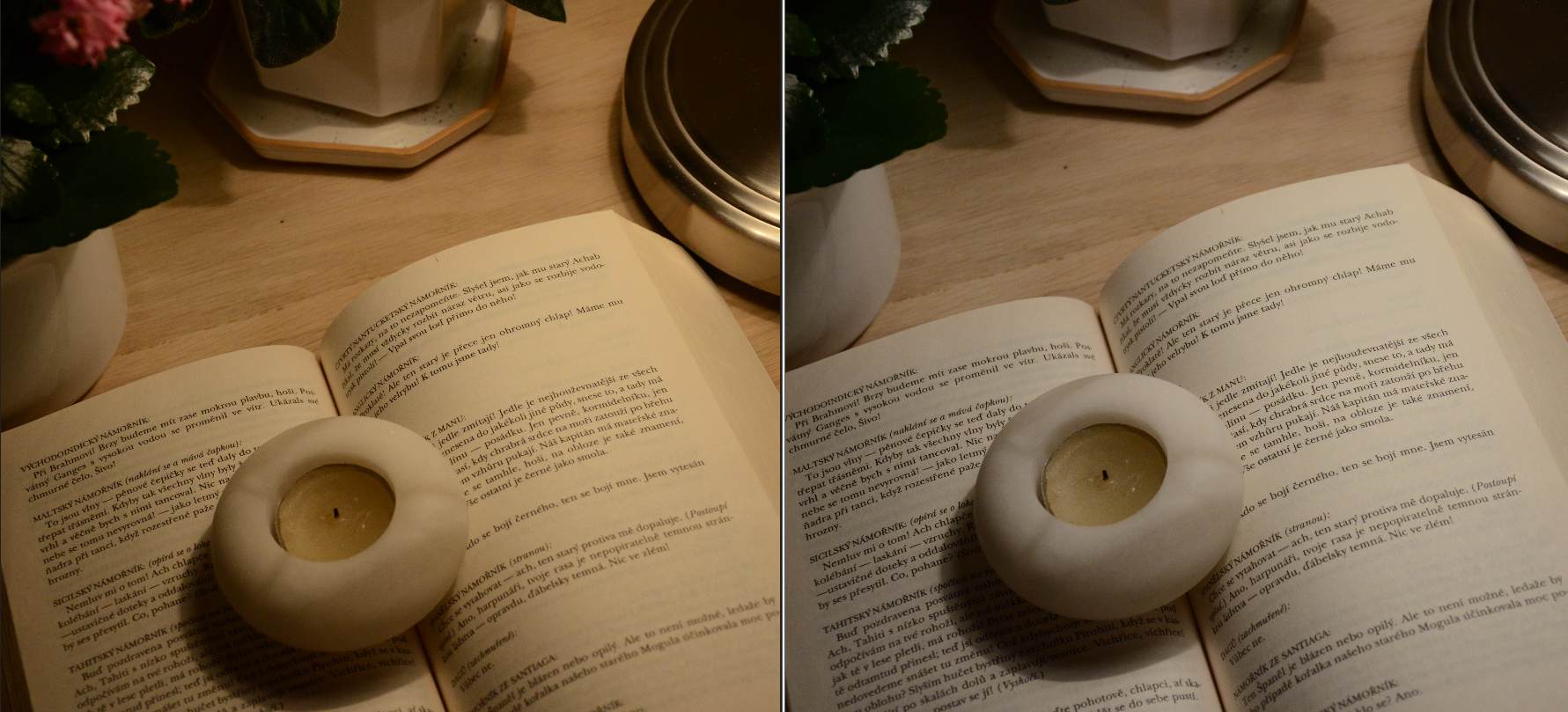 Nastavení bílé má dva módy automatické WB, oba velmi laskavě zacházejí se žárovkovým osvětlením. Předvolby jsou bez problému, samozřejmě s možností barevných posunů v plném rozsahu barevného prostoru. Na ukázce srovnání – auto a předvolba žárovka.