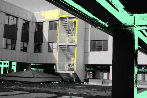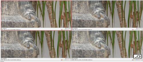 Kresba použitého objektivu 50/1.8 je doslova ultimativní a velký dojem vyvolává i dynamický rozsah snímků. Ovládání expoziční korekce je pěkná otrava, ale je to v podstatě zbytečná funkce (neberte to doslova…). Dynamický rozsah přístroje je udivující a věru jsem neměl potřebu něco s korekcí expozice dělat. Na obrázku č. 7 vidíte doslova extrémní situaci, foceno z hlubokého stínu za prudkého slunce, protější stěny jsou bílé. Tyrkysová označuje slité stíny, žlutá přepaly – jde o JPG, přirozeně že z RAW by se dal získat kompletnější snímek.