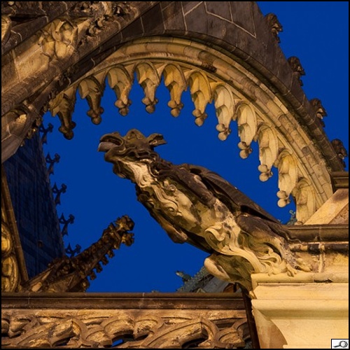 Na první pohled byste nepoznali, že jde o fotku pořízenou v noci. Jenže ve dne nikdy takto ty chrliče neuvidíte, protože jsou ve stínu a shora je přezáří denní obloha. Musíte tam jít za soumraku, se stativem… a použít všechny zásady, které jsem vypočítal nahoře. No a pak vznikne neobvyklá noční fotka, která nevypadá jako noční fotka a komu ji ukážete, bude si lámat hlavu, jak jste to mohli takhle vyfotit. 🙂