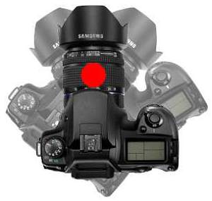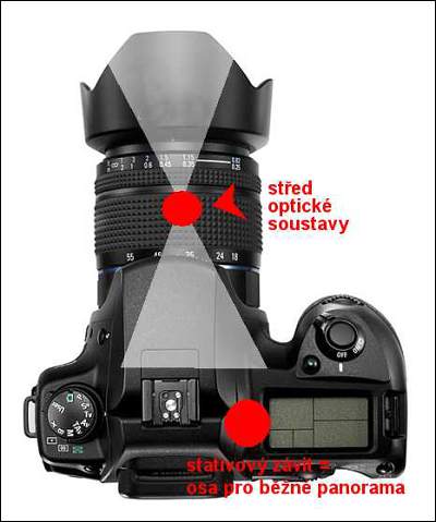 Je to vidět na tomto schematu. Spodní tečka přibližně ukazuje místo, kde je stativový šroub. Jakmile máme aparát umístěný na standardní stativové hlavici, aparát se bude otáčet podle této osy. Problém ale je v tom, že střed optické soustavy je jinde. Záleží na konstrukci objektivu – a u zoomů na aktuálním nastavení ohniskové vzdálenosti. Schematicky ukázáno je to asi tam, kde je ten výše uložený terčík na našem obrázku. Na spodní ukázce vlevo je vidět, jak se aparát otáčí podle osy vedoucí skrz stativový šroub, vpravo pak je vidět, jak by se otáčel, kdyby osa procházela optickým středem soustavy.