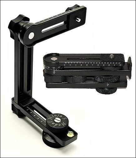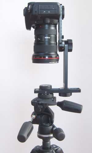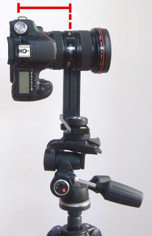 Fotoaparát je třeba nejdřív adjustovat – pro každý objektiv – a pro každou používanou ohniskovou vzdálenost zoomu zvlášť. Na další ukázce vlevo vidíme, jak se nastavuje přístroj na optickou osu, vpravo pak je vidět, jak je vzdálená osa otáčení od stativového šroubu.
