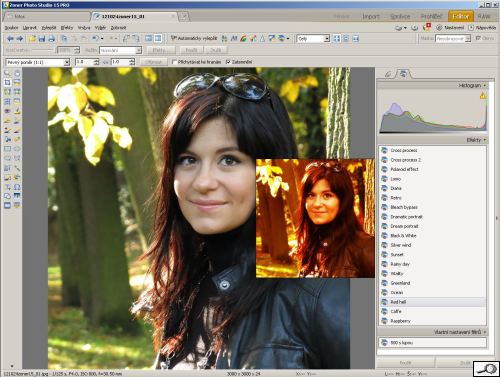 Ve verzi ZPS 15 totiž poněkud splývají obě oblasti, Efekty a Hromadné filtry. K tomu se dostaneme, teď nepředbíhejme událostem a radujme se z nových efektů jako dítě pod stromečkem. Jak to vypadá vidíte zase na ukázce, kvůli úspoře místa je na screenshotu jen prvních šest filtrů, celkem jich je devatenáct. Nahoře je histogram, ten se samozřejmě dá vypnout. Pracuje se s tím velmi jednoduše. Na ukázce vidíte Editor s otevřeným Bočním panelem a právě jsem najel kurzorem na jeden z těch filtrů. V obrázku se otevře náhled, který mě informuje o výsledku. Je to nesmírně jednoduché a názorné. V podstatě jen vybíráte a potvrzujete.