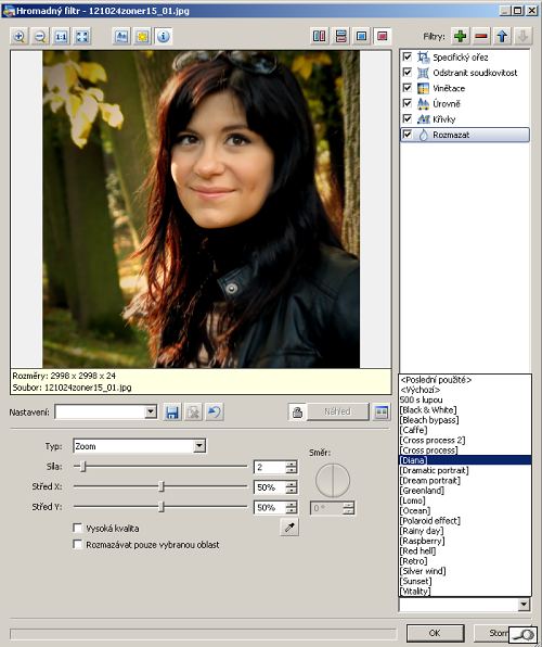 Toto je trochu vyšší dívčí a doporučuji to jen tomu, kdo má zkušenost s hromadnými filtry a jejich nastavováním. Ze začátku bohatě vystačíme s nabídnou efektů v Bočním panelu. Tato funkce je významné obohacení dosavadní palety nástrojů a funkcí v Zoneru Photo Studiu.
