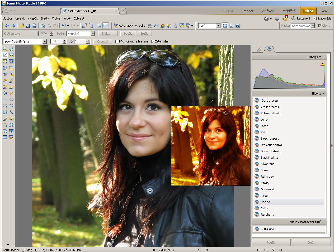 Ve verzi ZPS 15 totiž poněkud splývají obě oblasti, Efekty a Hromadné filtry. K tomu se dostaneme, teď nepředbíhejme událostem a radujme se z nových efektů jako dítě pod stromečkem. Jak to vypadá vidíte zase na ukázce, kvůli úspoře místa je na screenshotu jen prvních šest filtrů, celkem jich je devatenáct. Nahoře je histogram, ten se samozřejmě dá vypnout. Pracuje se s tím velmi jednoduše. Na ukázce vidíte Editor s otevřeným Bočním panelem a právě jsem najel kurzorem na jeden z těch filtrů. V obrázku se otevře náhled, který mě informuje o výsledku. Je to nesmírně jednoduché a názorné. V podstatě jen vybíráte a potvrzujete.