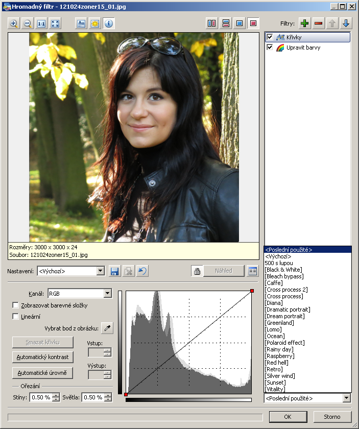 Toto je trochu vyšší dívčí a doporučuji to jen tomu, kdo má zkušenost s hromadnými filtry a jejich nastavováním. Ze začátku bohatě vystačíme s nabídnou efektů v Bočním panelu. Tato funkce je významné obohacení dosavadní palety nástrojů a funkcí v Zoneru Photo Studiu.