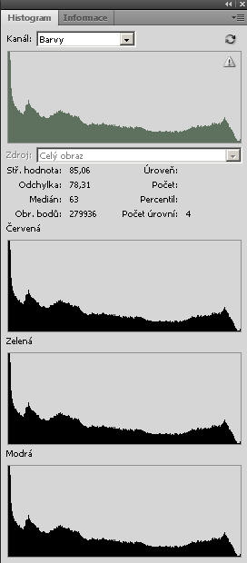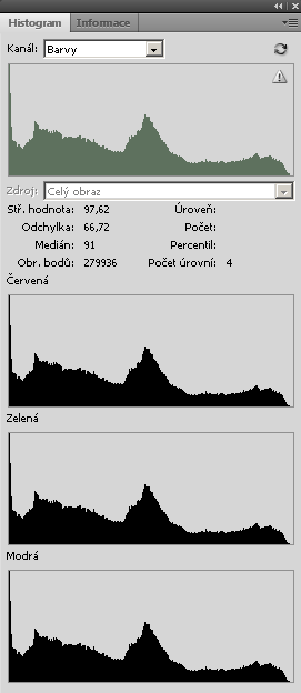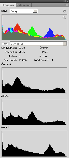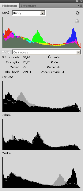 Photoshop umí zobrazit všechny tři kanály v jednom a také histogramy jednotlivých kanálů. Vidíme tedy, že se červený, zelený a modrý kanál vzájemně liší: