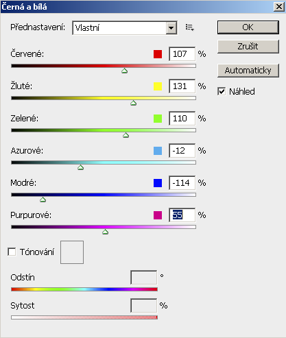 Vyrobit černobílý obrázek je tedy snadné, stáhneme sytost na nulu a je to. Ovšem to je nejjednodušší a nejméně efektivní způsob. My jsme totiž schopni při převodu barevného na černobílý některé barvy potlačit a jiné zvýraznit. V Photoshopu se to dělá například na kartě převodu do černobílého obrazu, zde vidíte různě posunutí hodnoty barevných odstínů: