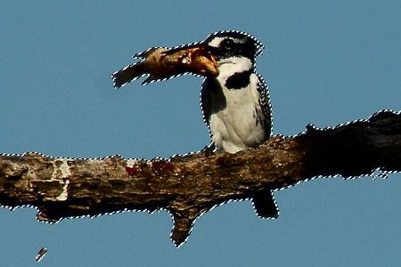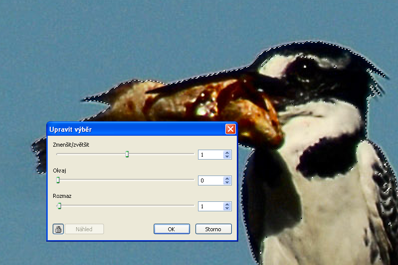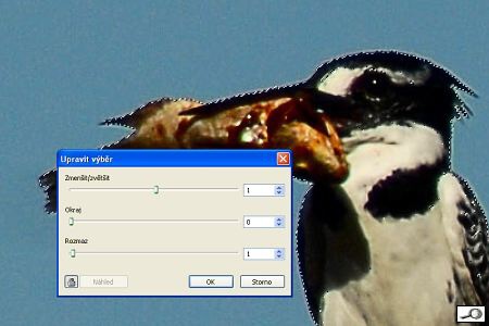 A co je nejdůležitější, my můžeme spojovat výběry s různým stupněm prolnutí, jak je to vidět na ukázce zde vpravo. To ale už není žádná maska, to jsem do výběru nástrojem kbelíček nalil červenou barvu se stupněm tolerance 255 (= vyplň vše), aby okraje výběru byly dobře vidět. Pokud by z toho někdo byl tumpachový, nedivil bych se tomu, proto si to ukažme na příkladu: ![]() Vám se ještě nikdy neoblékali samurajové v kuchyni? Jistě to stojí za vyfocení. Zkusme z téhle docela obyčejné fotky udělat “tajemný portrét. Utopím celé pozadí do černé a nechám jenom bojovníka. Jeho profil dám do výběru s nulovým prolnutím, kdežto hlavu a ramena s maximálním prolnutím 200 bodů. To vše v jednom výběru. Jakmile je výběr hotov, provedu inverzi, tedy obrátím výběr naruby a to co bylo vybráno je mimo výběr. No a zde je výsledek: ![]() Na obrázku je jasně vidět, že černá se dostala až k profilu bojovníka, s nulovým prolnutím jsem si pohrál i s brýlemi. Kdežto temeno, zátylí a ramena ubíhají do černé pozvolna. To je trik výběru s různým prolnutím. Konec opáčka ![]() Vybrané nebe ztmavím – třeba posunutím jezdce pro černý bod ve funkci úrovně a nebe ztmavne. Jenže kolem ptáčka se mi objeví nemilá bílá linka. Je to proto, že kontury nejsou nikdy přesné, je kolem nich jakási neurčitá bariéra. Zkrátka, to nepříjemné vypadá takto: ![]() Proto mají lepší editory funkci upravit výběr. Touto funkcí mohu rozšířit či zúžit výběr, vyhladit jeho okraje a nastavit prolnutí. Ale pozor – toto je jednorázová akce, tedy nelze na půlku výběru tímto nástrojem nastavit dejme tomu nulu a na druhou půlku stovku bodů. ![]() ![]() |