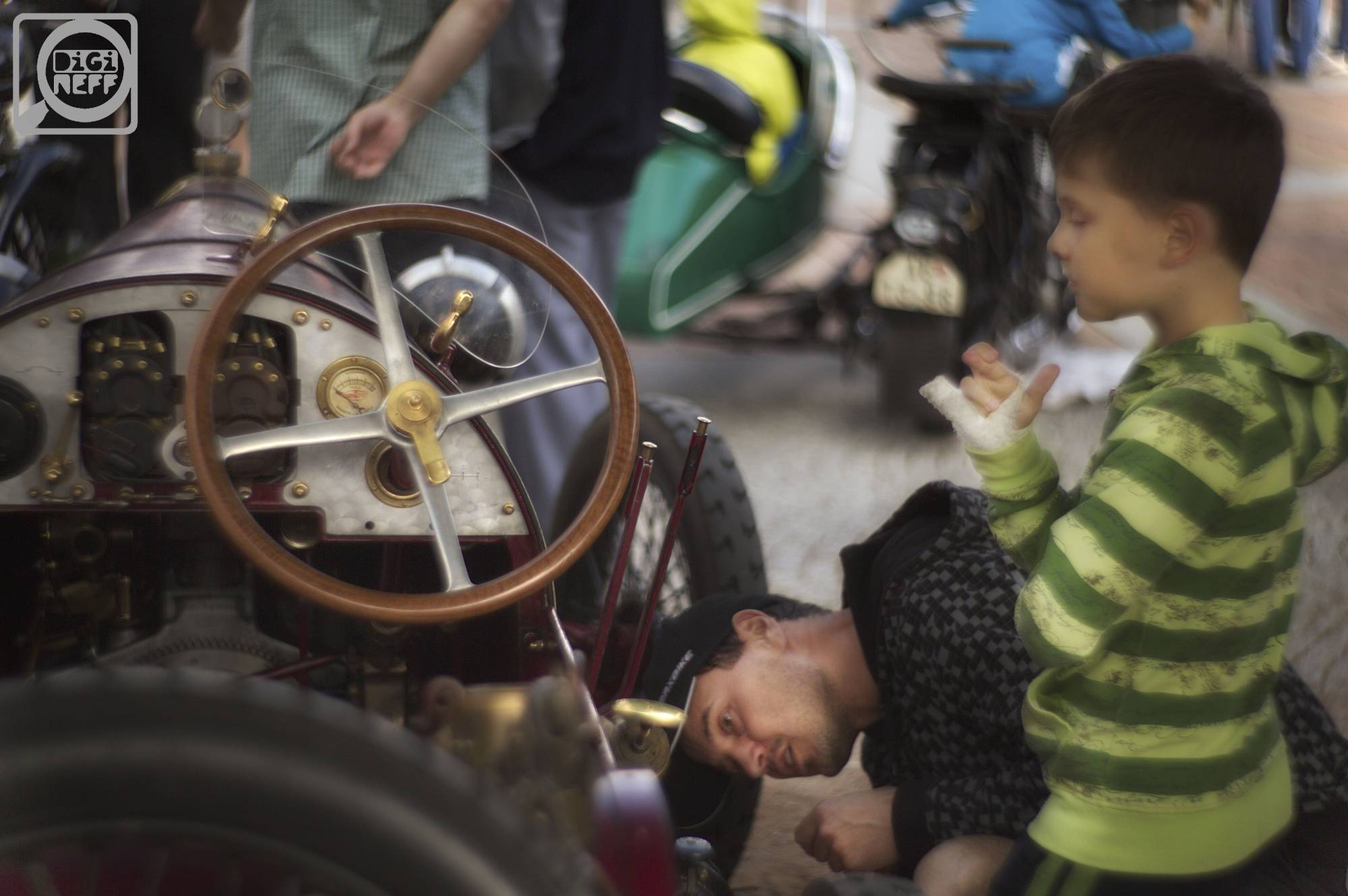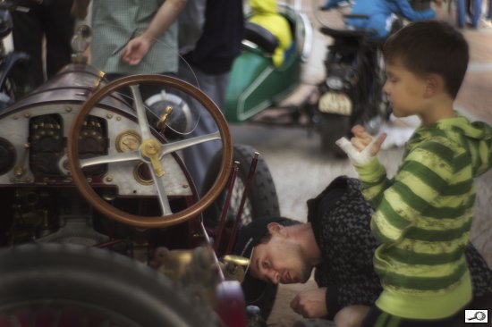 Následující fotka se jmenuje Bugatti. Ono to ohnisko 85 na plnoformátové zrcadlovce je v podstatě na živou fotku typu street velmi vhodné, zobrazí pěknou perspektivu, a má – tento objektiv – malou hloubku ostrosti. Zde jsem ostřil na volant, ale kupodivu i oba pánové, mladý a ještě mladší, se vcelku vešli do přijatelného pásma zobrazení. Není to hloubka ostrosti. Je to prostě zobrazení, jak to umí Petzval.