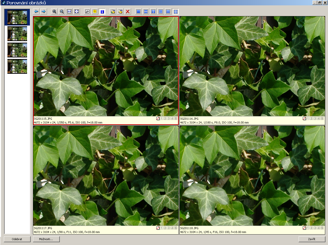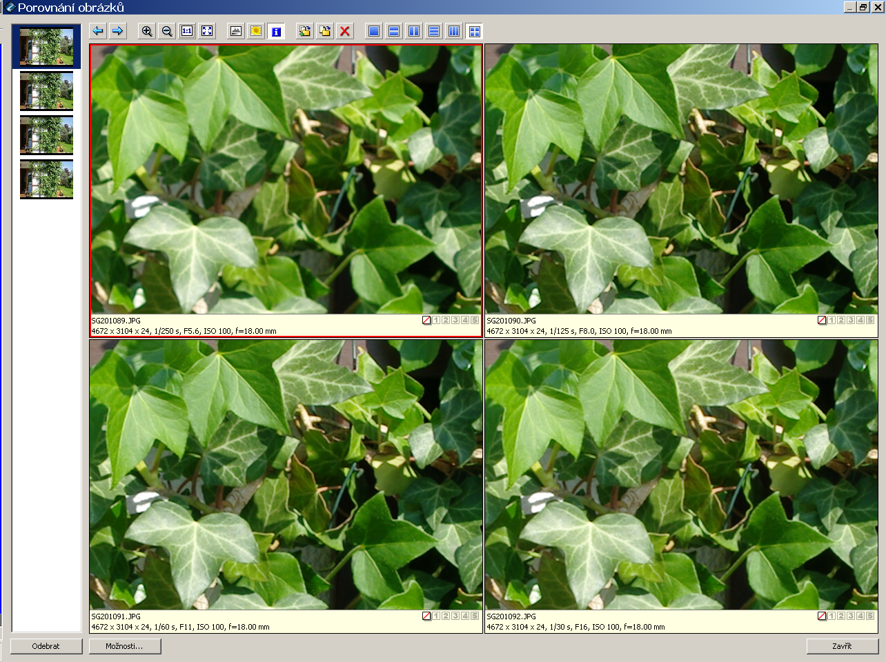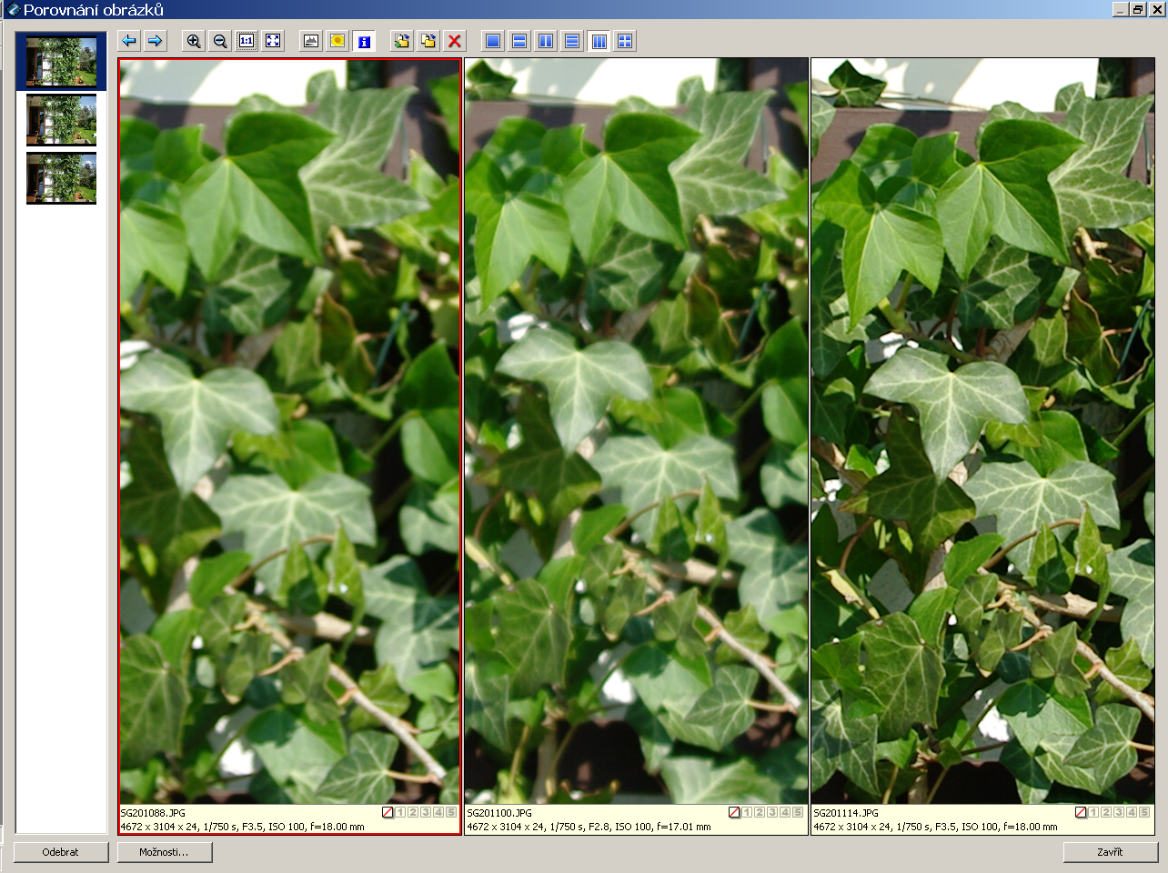 Jde o objektivy na první pohled nesouměřitelné. Samsung 18-55 mm AL 3.5-5.6 Tamron SP AF 17-50 mm F/2,8 XR Di II Tamron AF 18-250 mm F/3.5-6.3 Di-II Takto objektivy vypadají: ![]() A toto je první srovnání. Jde o výřezy 1:1, přičemž zleva jde o Tamron 18-250, Tamron 17-50 a Samsung 18-55, v nejširším úhlu záběru s plnou světelností: ![]() Je vidět, že setový objektiv si nevede vůbec spatně, nejslabší je Tamron 18-250. A takto to vypadá na delší straně, tedy při ohnisku 50 mm: ![]() Zde je opět setový objektiv nejlepší, ale odstup už není tak značný, kresba je velmi vyrovnaná. Podívejme se teď na průběh ostrosti při jednotlivých clonových stupních, srovnány jsou hodnoty vždy F5.6 / 8.0 / 11 a 16. Samsung 18-55 mm ![]() Nahoře 18 mm, dole 55 mm ohnisko. Je vidět, že už F5.6 je velmi dobře použitelná clona pro maximální kresbu. V praxi je značný odstup od plné světelnosti, nejen v kresbě, ale i v podání stínů, při vyšší clobně jsou stíny více prokreslené. ![]() Tamron SP AF 18-250 mm ![]() Nahoře 18 mm, dole 50 mm ohnisko. Odstup kresby je zde značný, takže radosti začínají na F8.0 při širokém úhlu záběru a dokonce na F11 při ohnisku 50 mm. To je projev onoho kompromisu, o kterém šla řeč výše. Za všechno se platí, i za pohodlí, že v tomto objektivu máme fakticky tři ohnisková pásma v jednom, bez nutnosti výměny. ![]() Tamron SP AF 17-50 mm ![]() Nahoře 17 mm, dole 50 mm ohnisko. Výsledky při menší cloně jsou lepší než v předchozím případě. Nezapomínejme také, že radost zde začíná při F4.0, což je dosti velká hodnota. Clonu F2.8 využijeme v nízkých světelných hladinách, ve kterých bychom museli s menšími světelnostmi zápasit pomocí delších dob osvitu, anebo jich používáme při snímcích s malou hloubkou ostrosti. ![]() Závěr Zde jsou ukázky fotografií v plném rozlišení: |