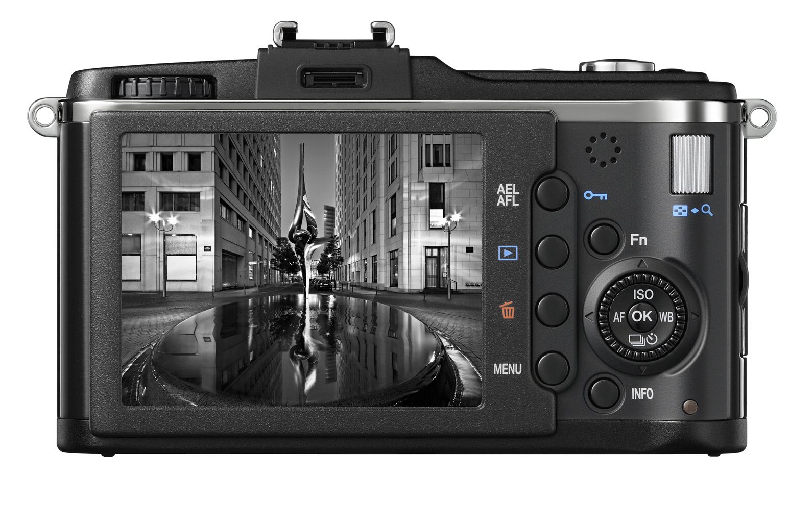 To je zajímavý bod, protože toto není obvyklé řešení, zpravidla je nutno EVF dokoupit – a zase obvykle za cenu vyšší než malou. K tomu účelu byly přepracovány sáňky pro blesk, do nich lze nasadit i adaptér pro externí mikrofon pro video. LCD monitor je třípalcový s 230 tisíci body, kryje 100% záběru. Interního blesku (vestavěného) jsme se dočkali až u třetí verze PENu, Olympus E-PL1, což je osekaná verze námi zkoumaného přístroje. Loni v listopadu jsem zde vyjádřil názor, že Olympus bude muset do PENu blesk vestavět, pokud nechce projekt zatlouct do země. No a vida, je to tady, bohužel ne v PEN2.