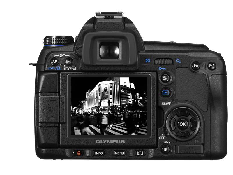 Ovládání a menu Už z úvodního stručného výčtu lze odhadnout, že přístroj je značně flexibilní, tedy lze ho nastavit “k obrazu svému”. Má dva stavové displeje, jeden je nahoře a druhý lze aktivovat stisknutím OK tlačítka na čtyřcestném voliči na zadní stěně na 2,7´´LCD displej. Tento způsob je vynikající, známe ho i z předešlých modelů E-řady Olympusu. Při troše zácviku lze tudy nastavit prakticky všechno, co v běžném provozu budeme potřebovat.
