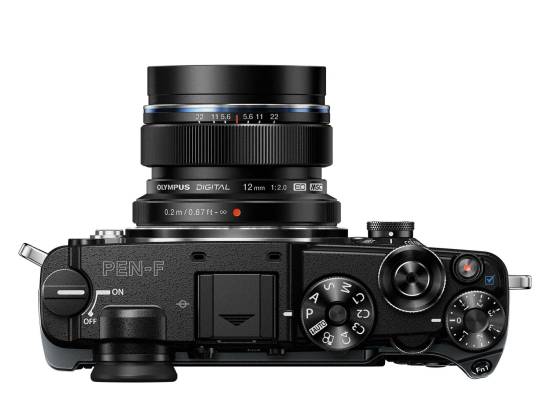 Oproti řadě OM-D a řadě PEN je tu prakticky všechno jinak. Netradiční je už zapínání kolečkem na levém rohu z pohledu fotografa, trochu připomíná přetáčecí kolečko kinofilmového přístroje. Moc šikovné to není, hezké ano Hned vedle je maličká kaplička pro elektronický hledáček, dále sáňky pro blesk a kruhový volič režimů: PASM (program, priority clony a času, plný manuál), automat, video a čtyři uživatelská nastavení, konečně! Následuje spoušť obkroužená rollerem, spúoušť videa a kruhový volič korekce expozice. Zadní roller se schoval pod horní hranu.