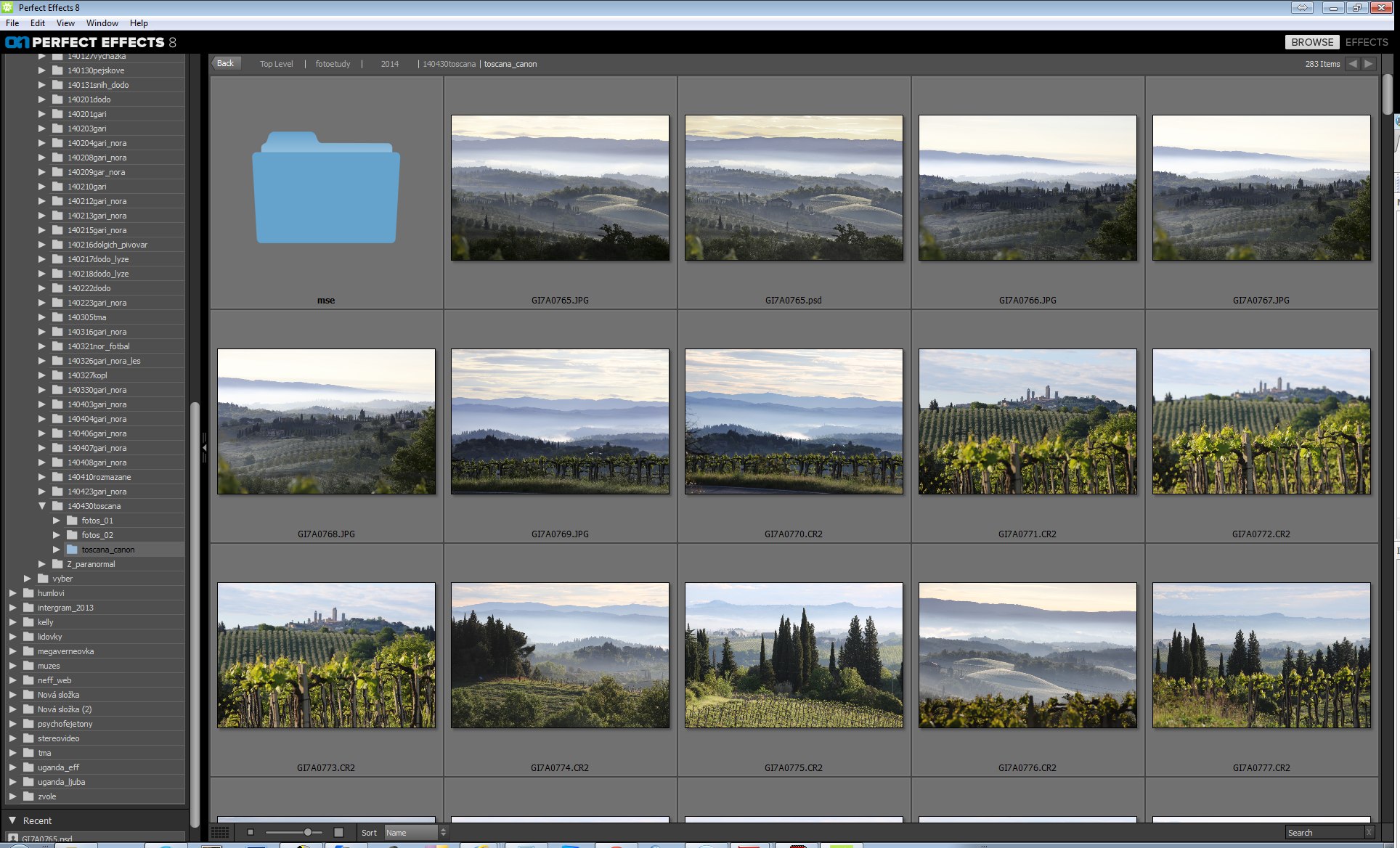 Aplikace má svoji sekci Browse, tedy obrazový manažer, a Effects. Na té první sekci není toho mnoho k vysvětlování. V levé části si otevřete adresářový strom a vpravo máte náhledy. Jejich velikost lze měnit a lze nastavit i třídění, podle názvu anebo podle data změny, kupodivu nikoli podle přípony. Je to jednoduché, střízlivé: