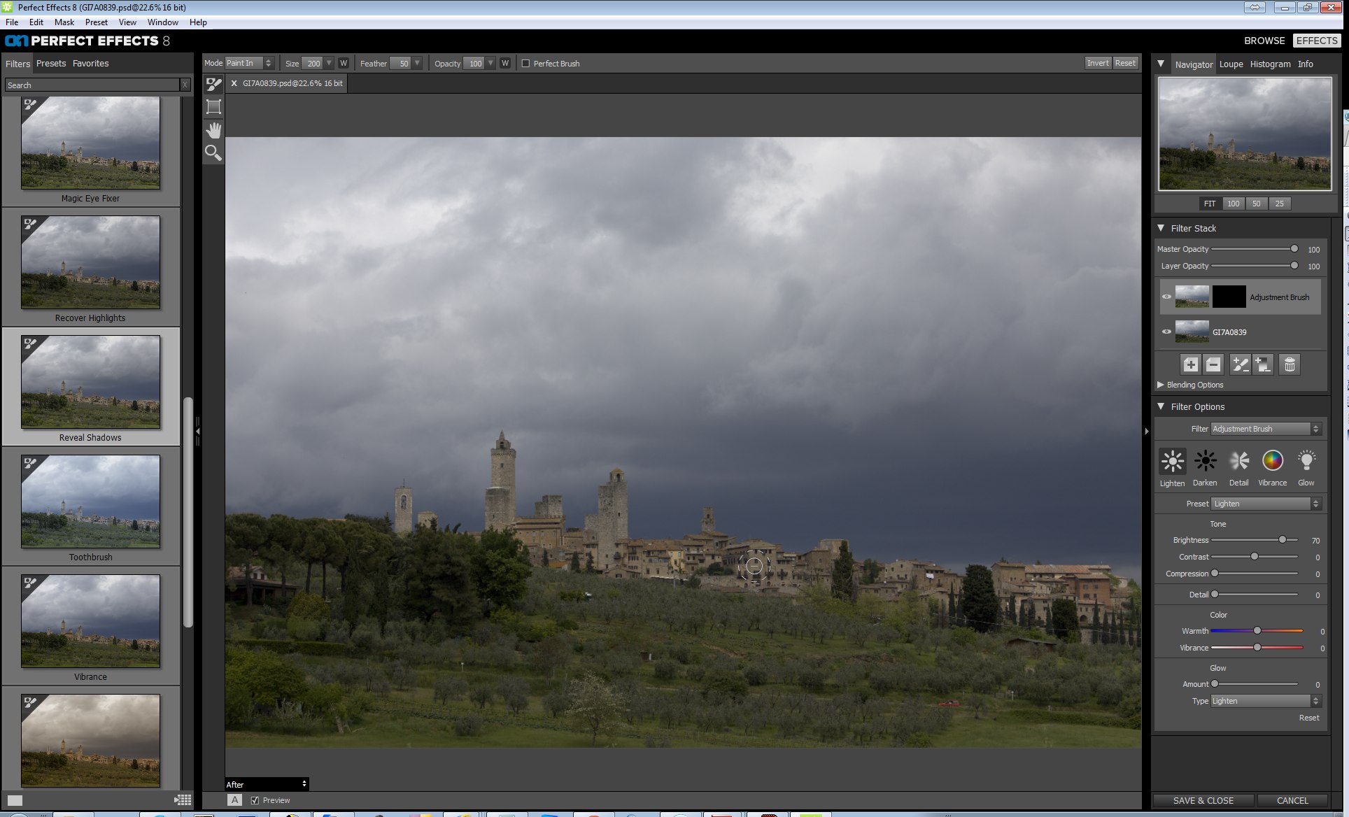 Pak už jsou volby efektového štětce: zesvětlit, ztmavit, zvýraznit detaily, zvýraznit barvy a zamlžit. Táhla o něco doleji slouží k doladění výsledku.