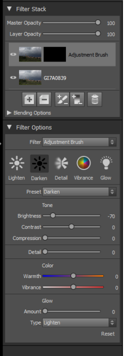 Aplikace funguje na systému vrstev. Zde je třeba trochu znát techniku práce s vrstvami a maskami. Ve výchozím nastavení se vytvoří nová vrstva s bílou maskou – tedy s maskou „odkryj změnu“ a vidíme efekt filtru. Ten lze celoplošně zmírňovat ubráním průhlednosti. Tím ovšem možnosti zdaleka nekončí: v panelu vpravo od náhledu lze volit přechod, pak aplikujeme filtr jen v části obrazu, anebo efektový štětec. Pak ovšem se maska aplikuje jako černá, tedy „zakryj vše“ a štětcem odkrýváme změnu (na ukázce je maska černá).