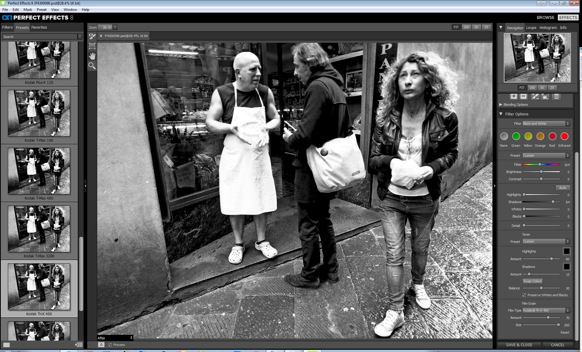 Totéž platí pro sekci Presets, předvolby. Zde je dobře si důkladně prohlédnout sekci True Film. To jsou napodobeniny charakteristik klasických černobílých filmů Fuji, Ilford a Kodak (naše Foma tu trestuhodně není, třebaže je to světově známý výrobce černobílých materiálů). Toto je samo o sobě něco, co by stálo za zájem, i kdyby to byla plně placená verze. Předvolba se dá rozsáhle korigovat – na ukázce vidíte aplikaci předvolby Kodak Tri-X 400 … a jsme o padesát let nazad!