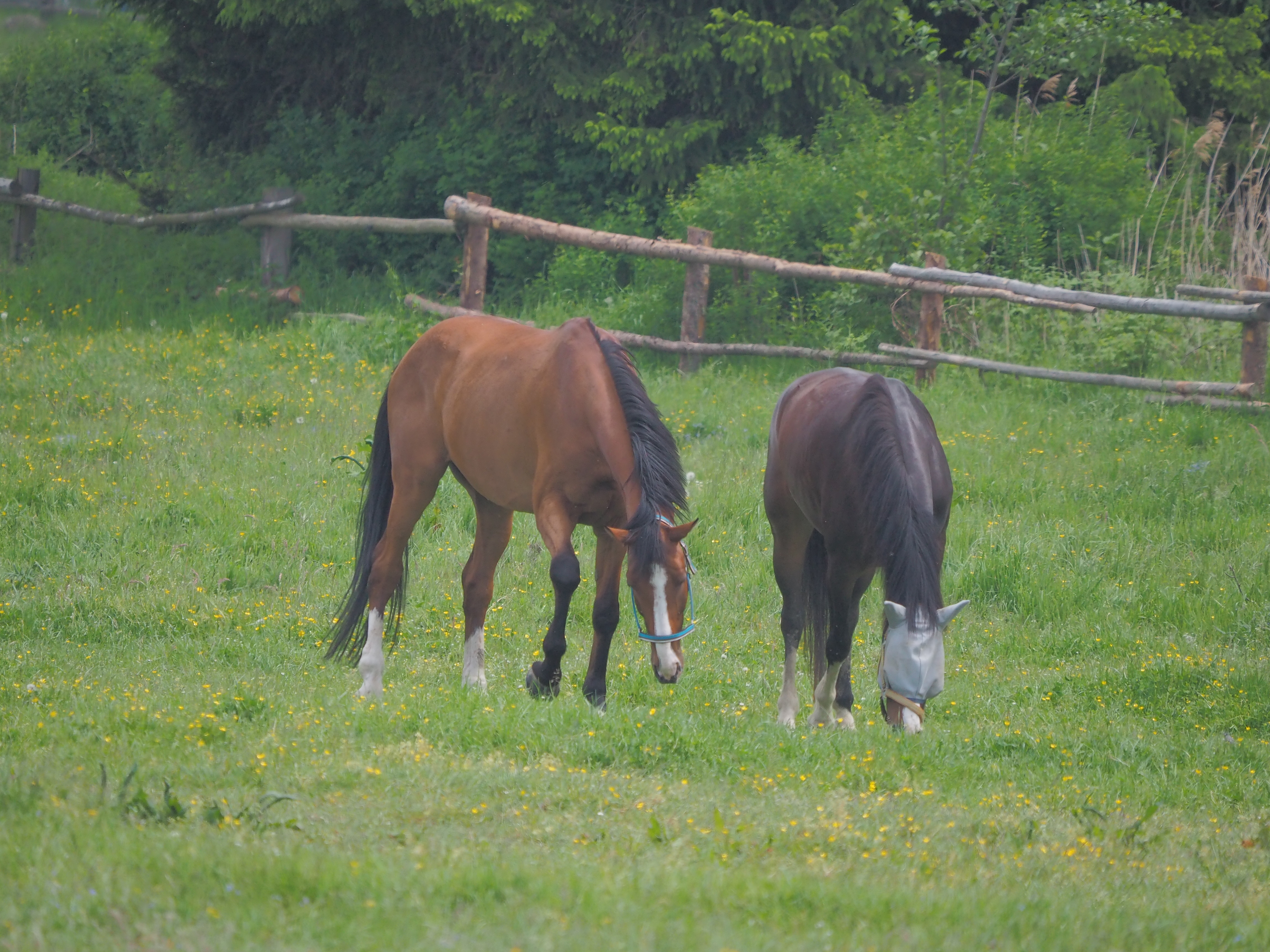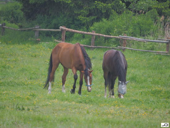 Při focení ze značné vzdálenosti se už projevuje neostrost vyvolaná chvěním vzduchu, to je obecná vlastnost těchto ultradlouhých ohnisek. Už proto je dobře fotit brzy z rána, kdy je vzduch studený a ne v poledne, jako tato fotka. Objektiv ostřil poněkud dozadu (back focus), je to vidět na trávě u kopyt koní.