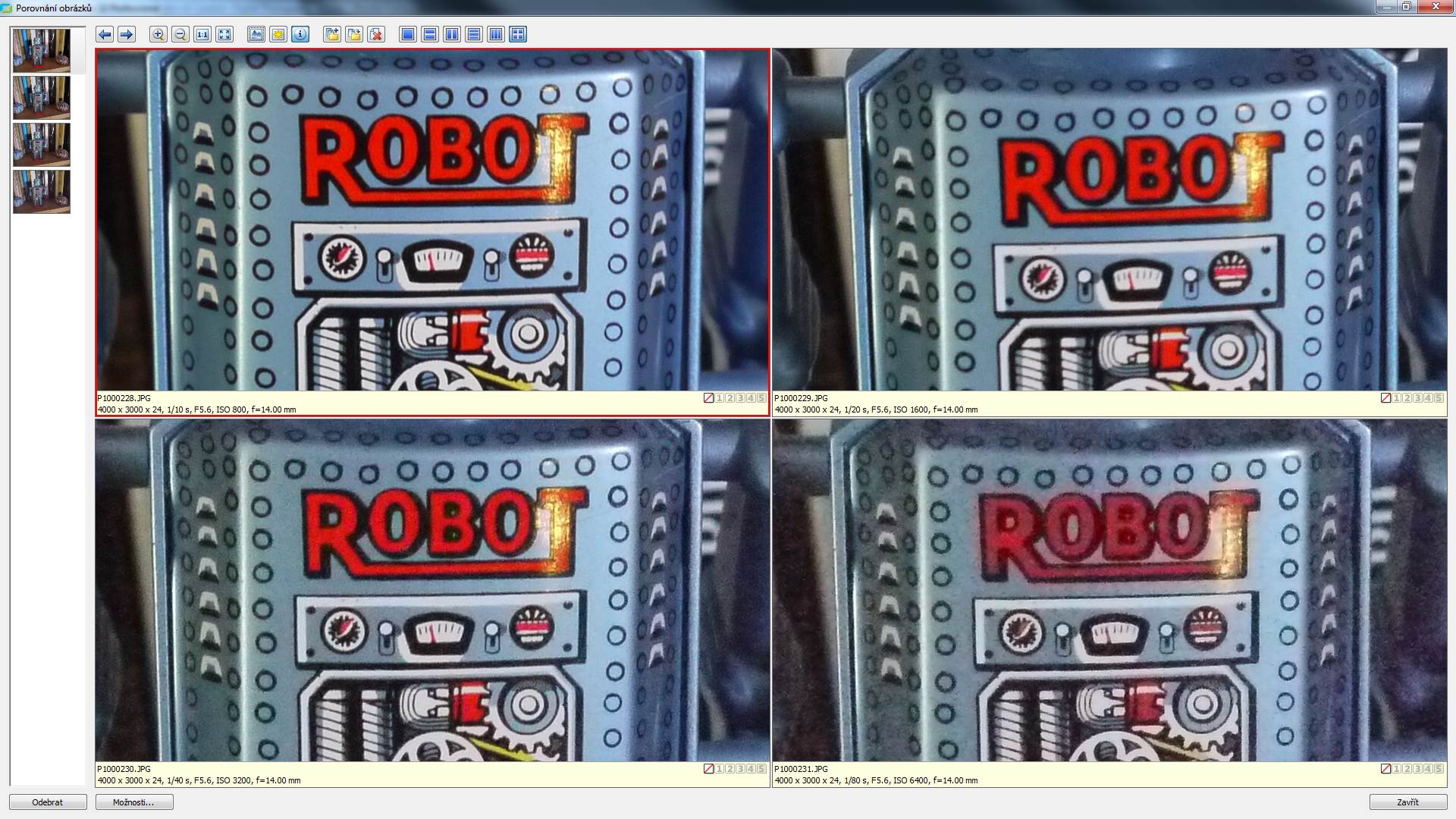 Přístroj nabízí cosi jako inteligentní rozlišení. Na rozdíl od inteligentní automatiky, která je zde také (připomínám, že má samostatné tlačítko, něco jako “záchrannou brzdu”, která je skutečně inteligentní, zde prakticky jde o doostření. Údajně by se mělo vyhnout plochám, a starat se jen o hrany, protože doostření velmi rádo zvýrazní šum. Efekt je mírně patrný: