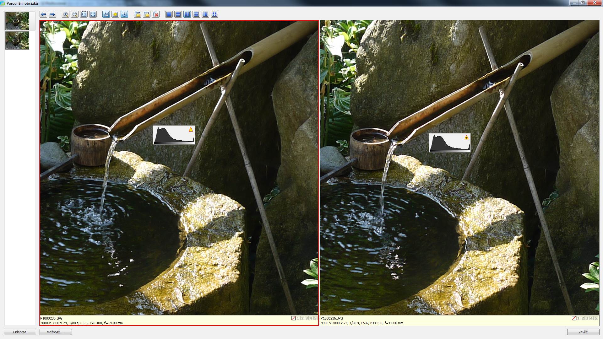 Nezdá se, že by bylo nutné toto opatření používat. Právě tak ne mnoho účinné se zdá projasňování stínů. Do obrázku jsem vložil i histogramy, které jsou v podstatě identické.
