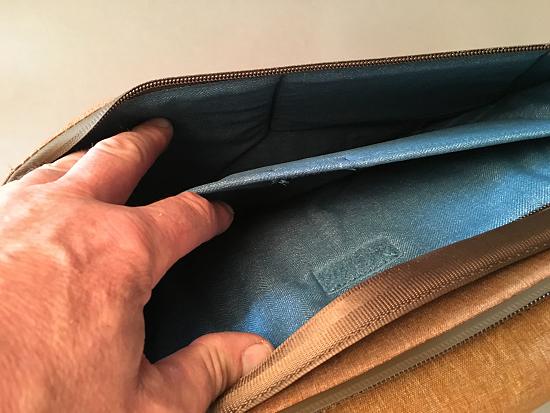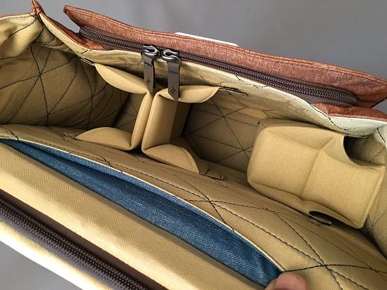 Vnitřek je velmi flexibilní. Zezadu je prostor pro notebook nebo tablet – přičemž brašna je dost velká na to, aby počítač nebyl vidět a nebudil tedy pozornost. Ostatně – i to je jedna z velkých předností brašny, že nevypadá jako brašna na fotoaparáty. Je to prostě – mesenžerská taška. Za zmínku stojí i přepážky. Ty jsou připevněny k vnitřku suchými zipy, a jsou skládací – tedy jejich výška je měnitelná. To je velká výhoda pro použití např. fotoaparátu s nasazeným teleobjektivem.