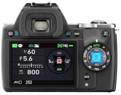 Ovládání a menu Zapíná se páčkou u spouště, bezesporu nejpohodlnější řešení. Kousek dál je tlačítko pro korekci expozice, eventuálně pro nastavení clony v M-ručním režimu. Zde je ergonomicky vzato moje jediná námitka, tlačítko je špatně dosažitelné. Vedle něho je zelené tlačítko pro reset nastavení. Obě tlačítka mají tradiční místo Pentaxů, ale tady jsou na velké vodorovné ploše a nedobře se ovládají. Horní ploše vévodí veliký plochý roller. Na jeho umístění je třeba si zvyknout, zvláště při výměně objektivu: tlačítko pro uvolnění bajonetu je na pravé straně dole u objektivu, takže vám palec nutně přilehne na rolleru a můžete si rozhodit nastavení.